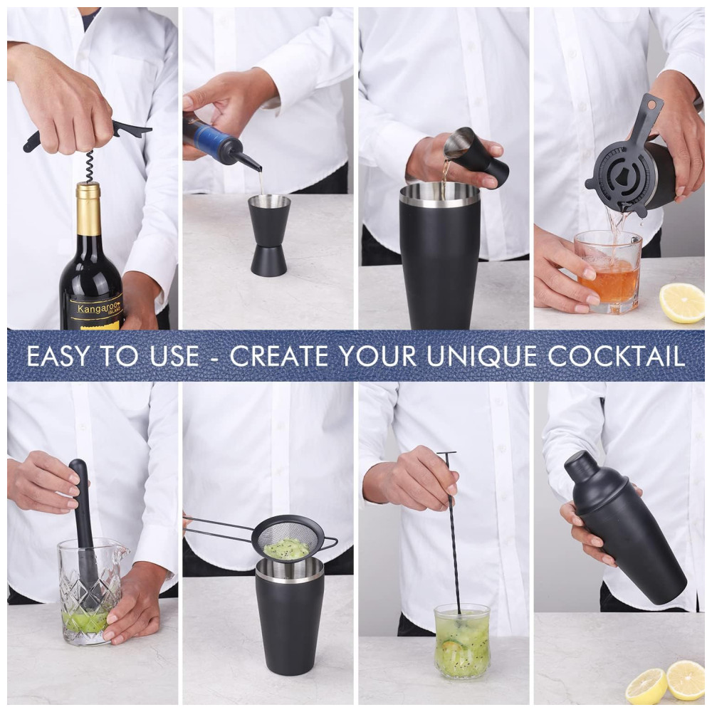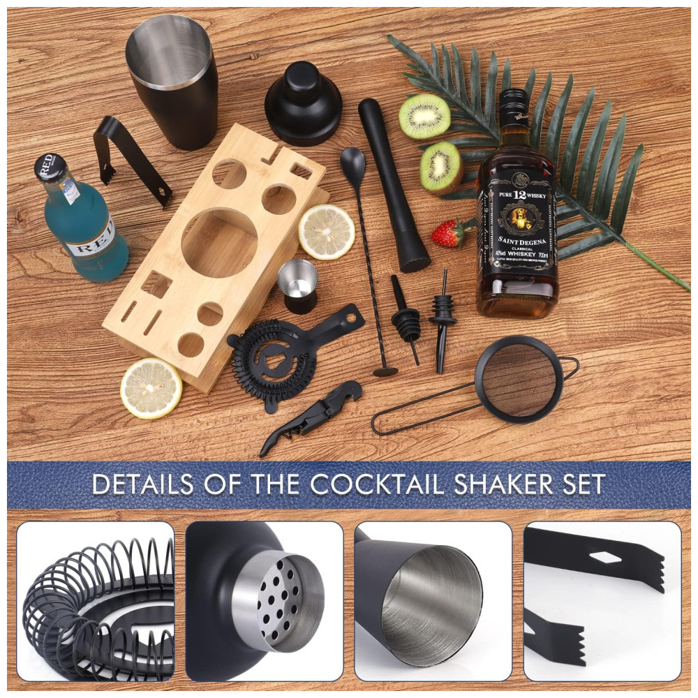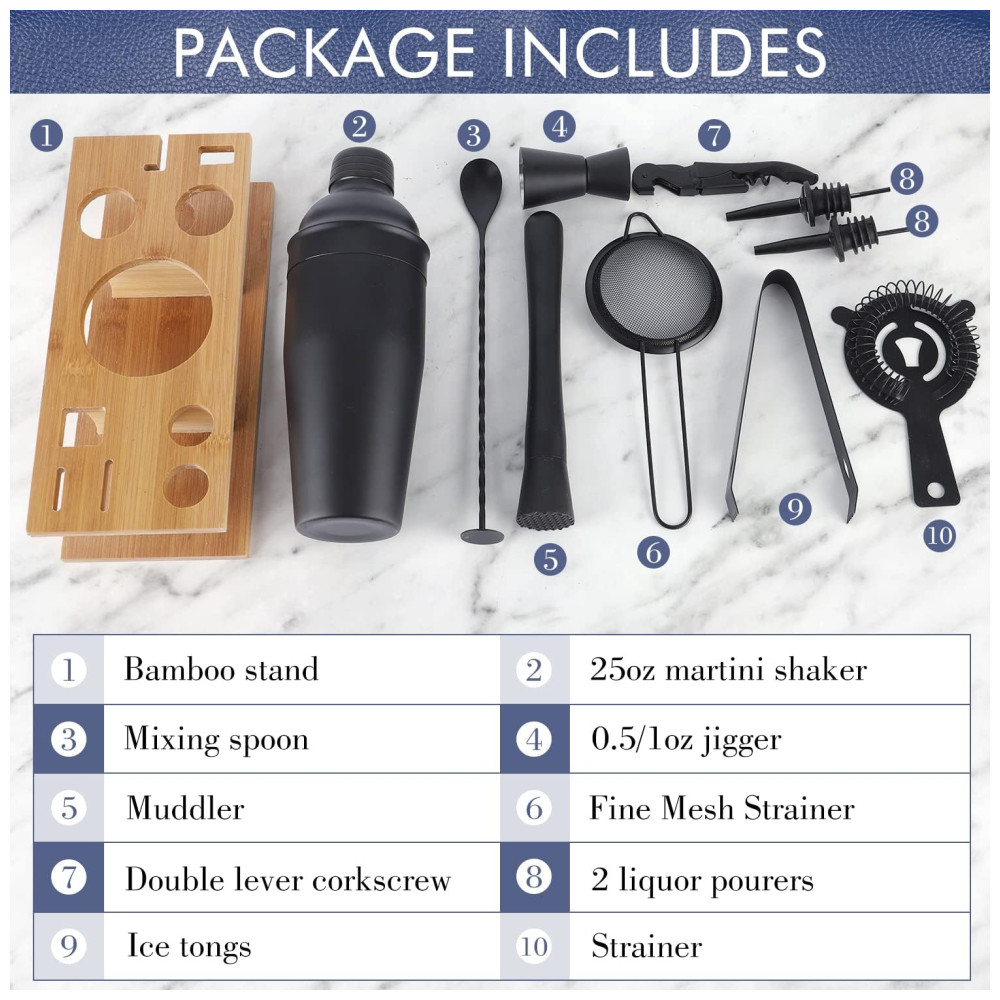Kit de coquetel para bartenderO kit de bartender Mixology inclui um agitador de aço inoxidável de 740mL, filtro, colher de mistura de coquetel de aço inoxidável de 10 polegadas, um copo medidor de tamanho duplo de 0,5, 1 oz, 2 dosadores de licor, muddler, pinças de gelo, filtro de malha fina, duplo saca rolhas de alavanca e um suporte de bambu.