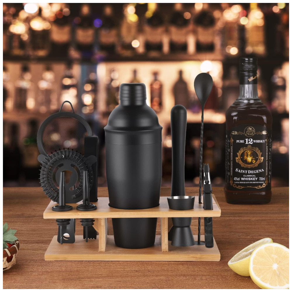 Kit Bartender Profissional 11 Peças em Aço Inoxidável com Suporte de Bambu JNWINOG Preto Fosco