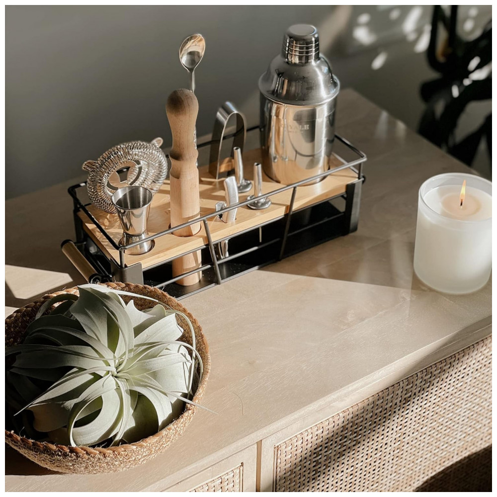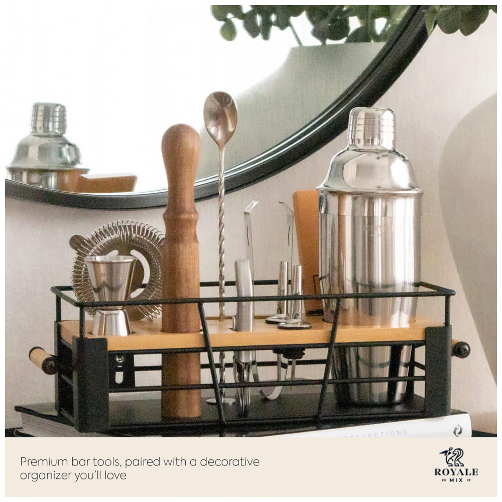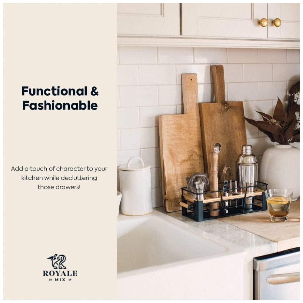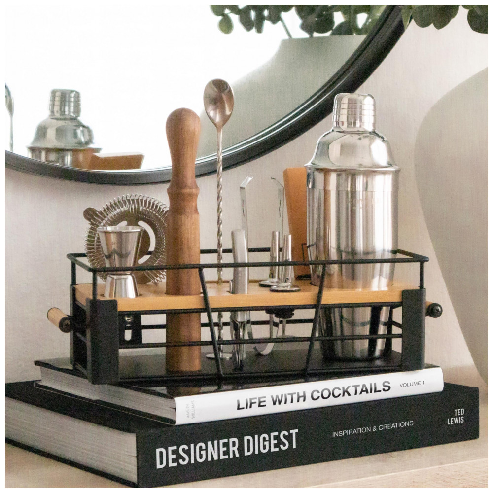 ORGANIZADOR DECORATIVO QUE VOCÊ VAI ADORAR COM UTENSÍLIOS DE BAR QUE VOCÊ PRECISA Um kit de bartender doméstico que organiza todas as suas ferramentas de bar para tê las sempre prontas para misturar coquetéis enquanto traz personalidade para sua casa Passe algum tempo desfrutando de suas deliciosas bebidas artesanais em vez de procurar as ferramentas certas em uma gaveta bagunçada.