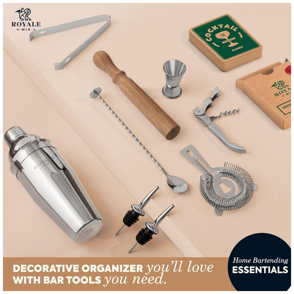 ESSENCIAIS DE BARTENDING EM CASA Este conjunto de coqueteleiras ROYALE MIX à prova de vazamentos para misturar bebidas inclui todas as ferramentas de barra essenciais 11 peças para fazer coquetéis o ano todo, além de um suporte feito à mão para organizá los com estilo. Crie coquetéis de nível profissional com confiança independentemente de você ser um bn experiente ou iniciante. Inclui um macerador em madeira de acácia maciça com pega ergonômica para facilitar o maceramento.