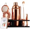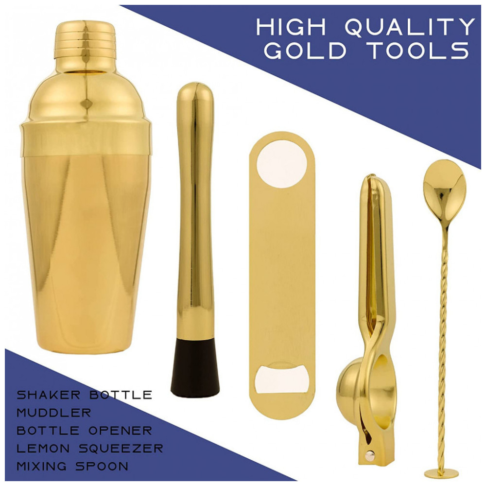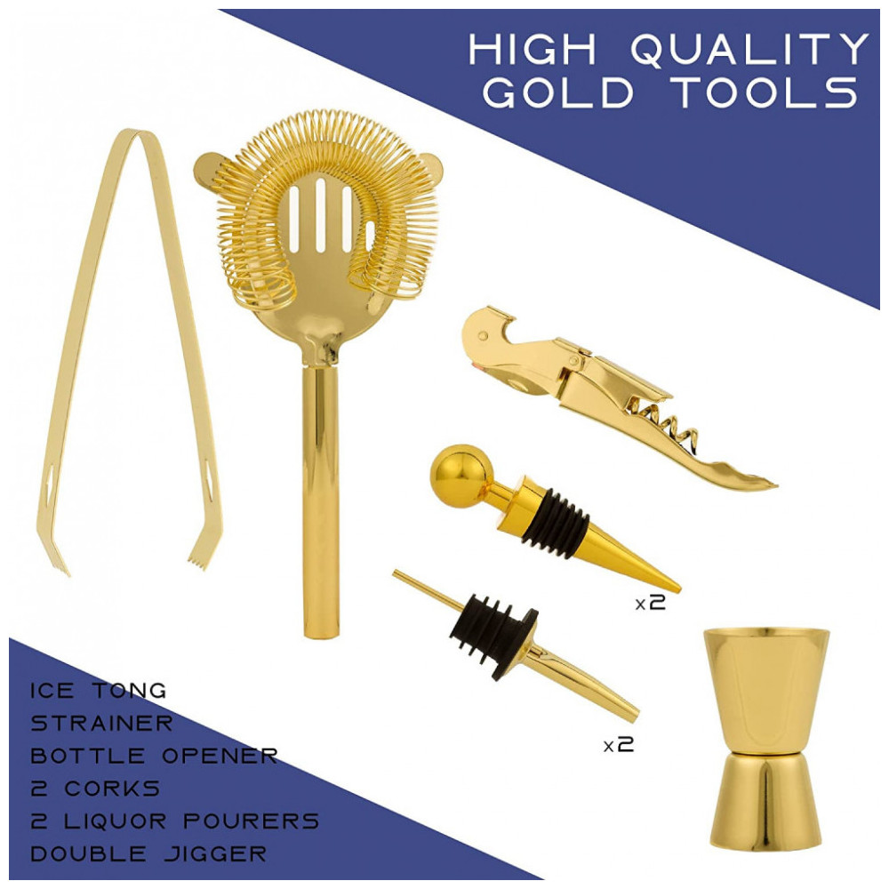 Ferramentas de coquetel bem feitas Seu kit de bartender de luxo com estojo vem completo com 1 coqueteleira de ouro de 710mL, 1 0,50mL , 1 onça duplo jigger, 1 muddler para coquetéis, 1 coador de coquetel, 1 par de pinças de gelo, 1 colher de mistura, 2 rolhas , 3 doses de licor e 1 saca rolhas.