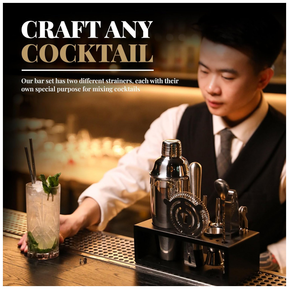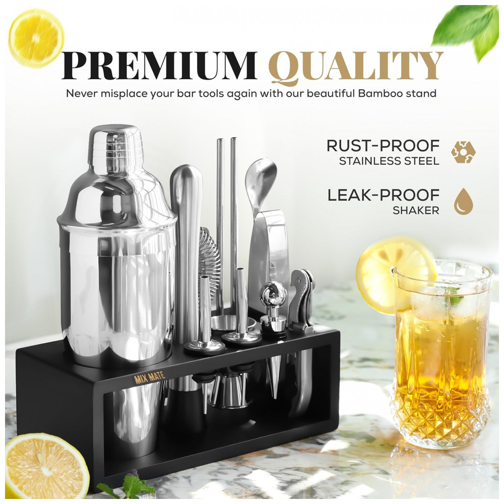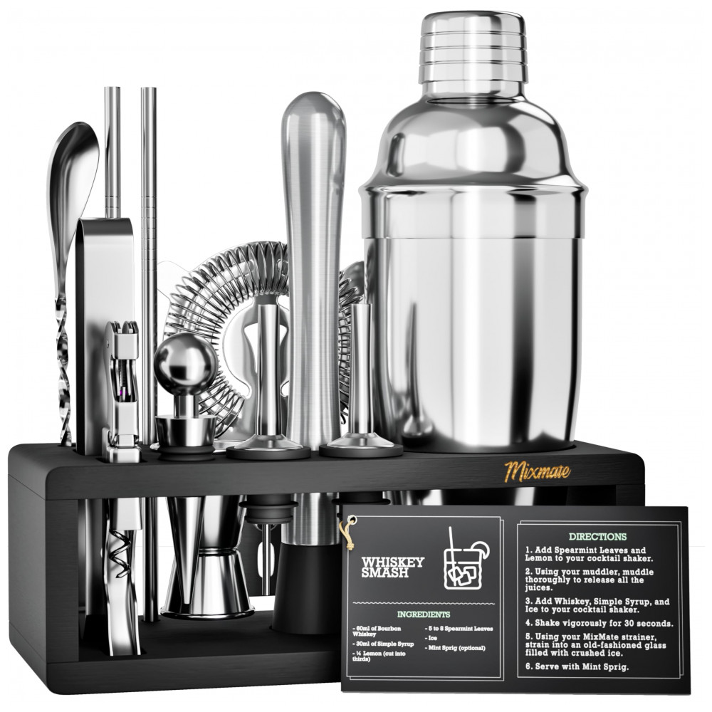 Kit Bartender Profissional 15 Peças em Aço Inoxidável com Suporte MixMate Prata