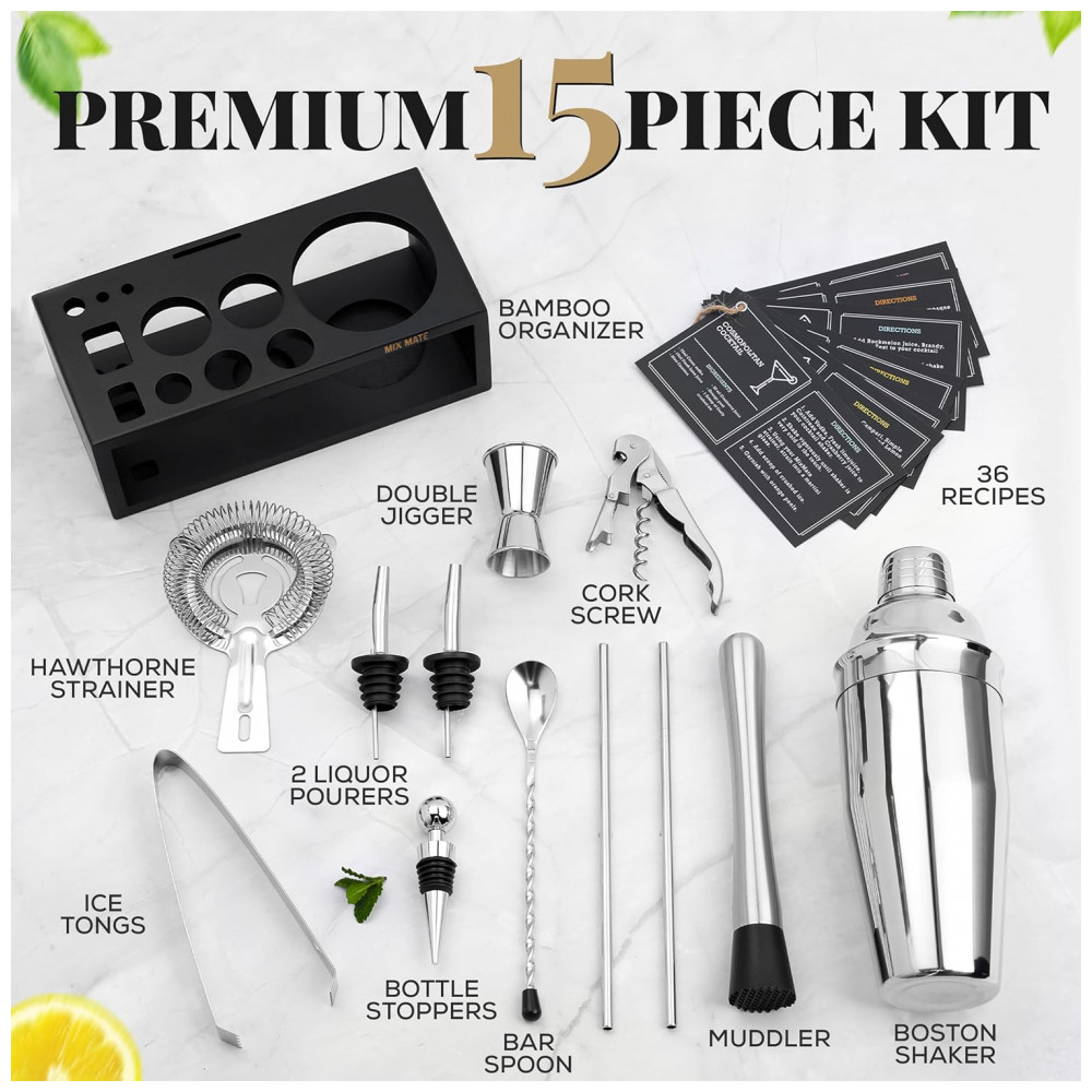 TUDO EM UM Este kit de coquetel de 15 peças inclui tudo o que você precisa para fazer drinks saborosos e saborosos, margaritas e qualquer outra bebida alcoólica que você possa imaginar no conforto de sua própria cozinha ou bar. Não há necessidade de comprar acessórios separados para obter uma bebida deliciosa, este conjunto de coqueteleira tem tudo