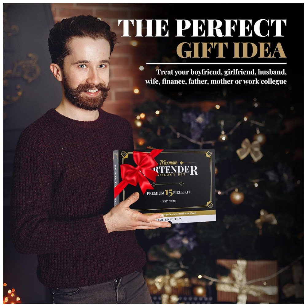 O MELHOR PRESENTE PARA OS AMANTES DE COQUETÉIS Você não está apenas presenteando um conjunto de bartender de qualidade premium, mas também uma experiência. A caixa de presente elegante é perfeitamente projetada para embalar o suporte de madeira, as ferramentas e o livreto de receitas. O sortudo que receber este presente certamente terá a emoção de uma criança na ilha dos brinquedos Não se esqueça de escanear o código QR em nosso cartão de agradecimento para obter um livreto digital GRATUITO de receitas de coquetéis