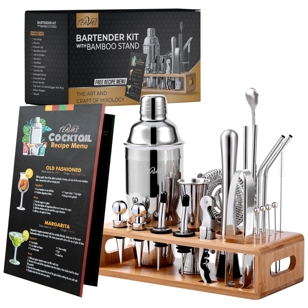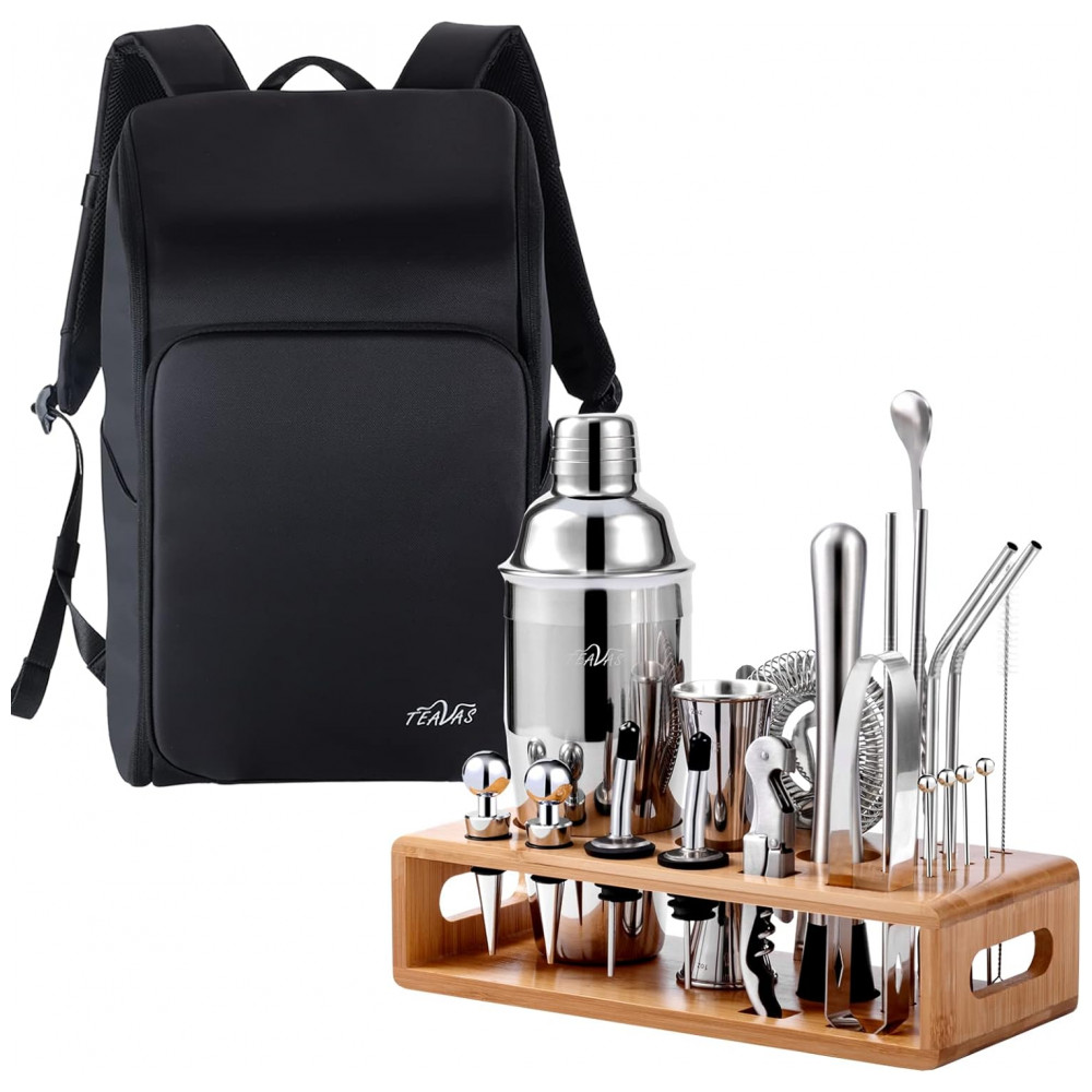 Kit Bartender Profissional 25 Peças em Aço Inoxidável com Suporte de Bambu e Mochila TEAVAS Prata