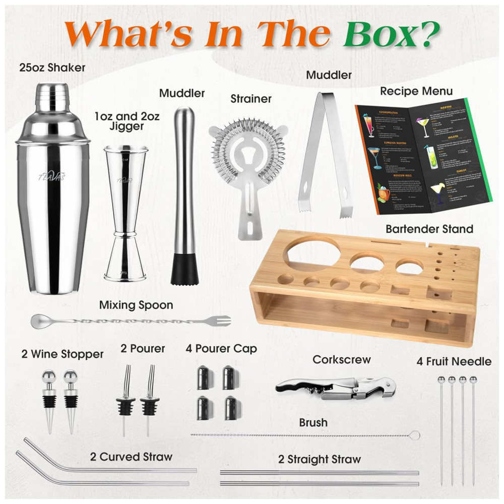 QUALIDADE PREMIUM Nosso kit bartender profissional é feito de materiais de qualidade premium, tornando o forte o suficiente para atendê lo por muitos anos. O conjunto vem com utensílios de barra de 25 peças feitos de material de aço inoxidável 304 de alta qualidade. Ele vem com um suporte de bambu de alta qualidade também.