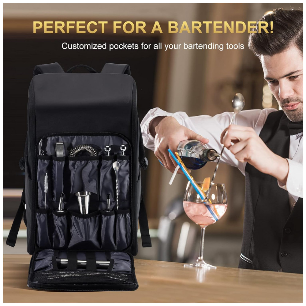Mochila de zenamento grande esta bolsa de bartender sofisticada tem vários bolsos internos e externos com seções de velcro ajustáveis para zenar até 6 garrafas de licor, ferramentas de bar, copos, cobertores, câmeras de roupas, jiggers, filtros, colheres, muddlers etc. o compartimento interno possui divisórias acolchoadas ajustáveis, permitindo personalização completa para suas necessidades individuais de serviço.