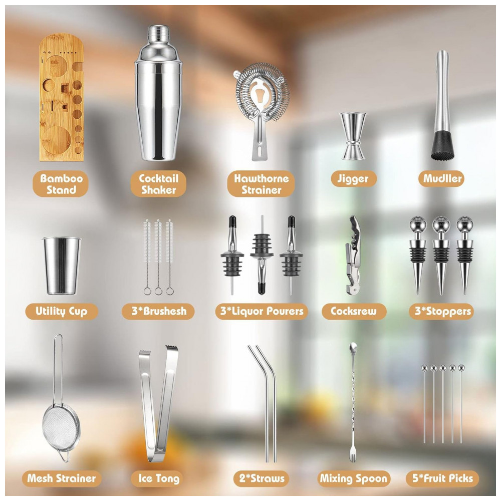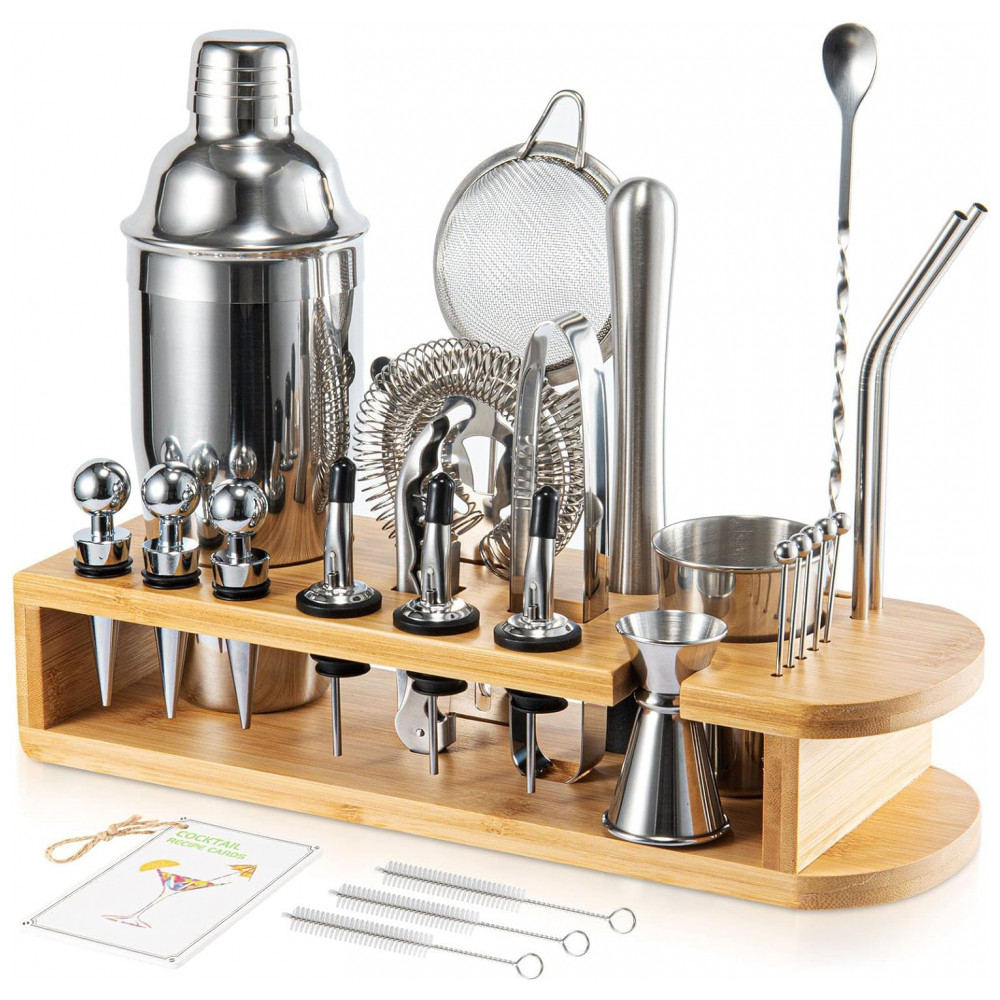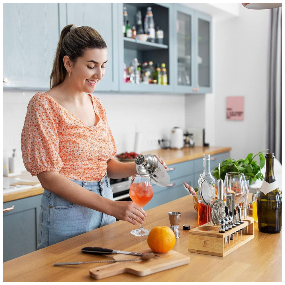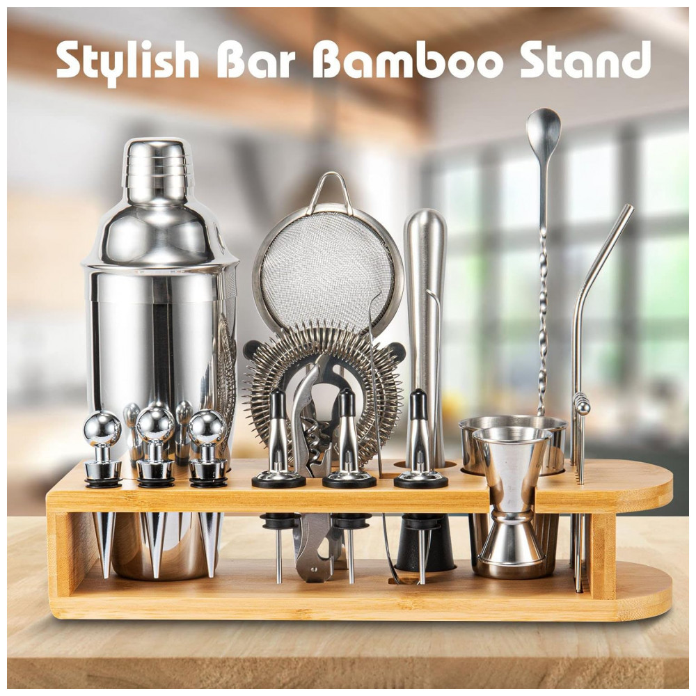 Kit Bartender Profissional 26 Peças em Aço Inoxidável com Suporte de Bambu Semderm Prata