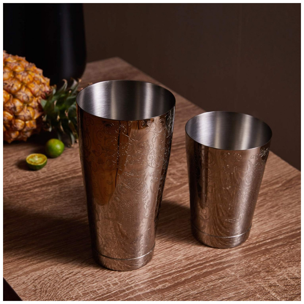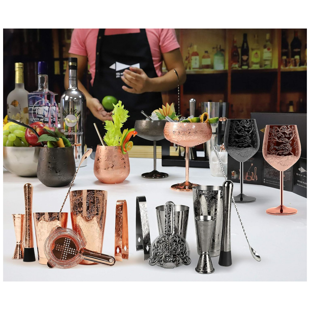 A elegância do kit de ferramentas Bar e seu aço inoxidável de qualidade premium brilham com graça perfeita e adicionam realeza à sua cozinha. Tem as clássicas gravuras delicadas dos tempos antigos. Apenas um conjunto de shaker de Boston como este pode corresponder à nobreza e estatura. O conjunto de coqueteleira de cor preta fará você se sentir como um cavaleiro da meia idade.