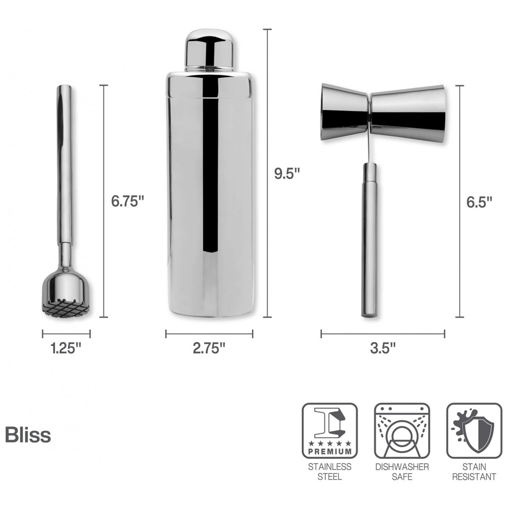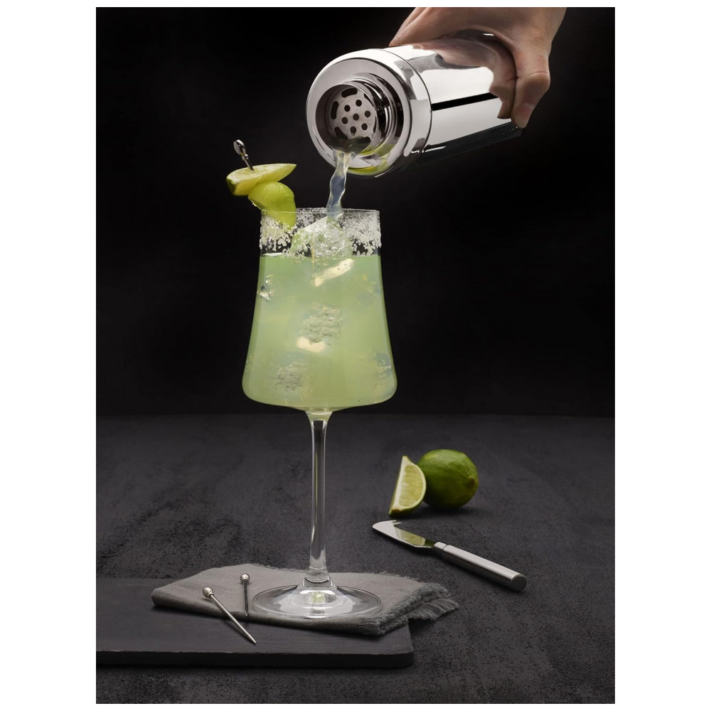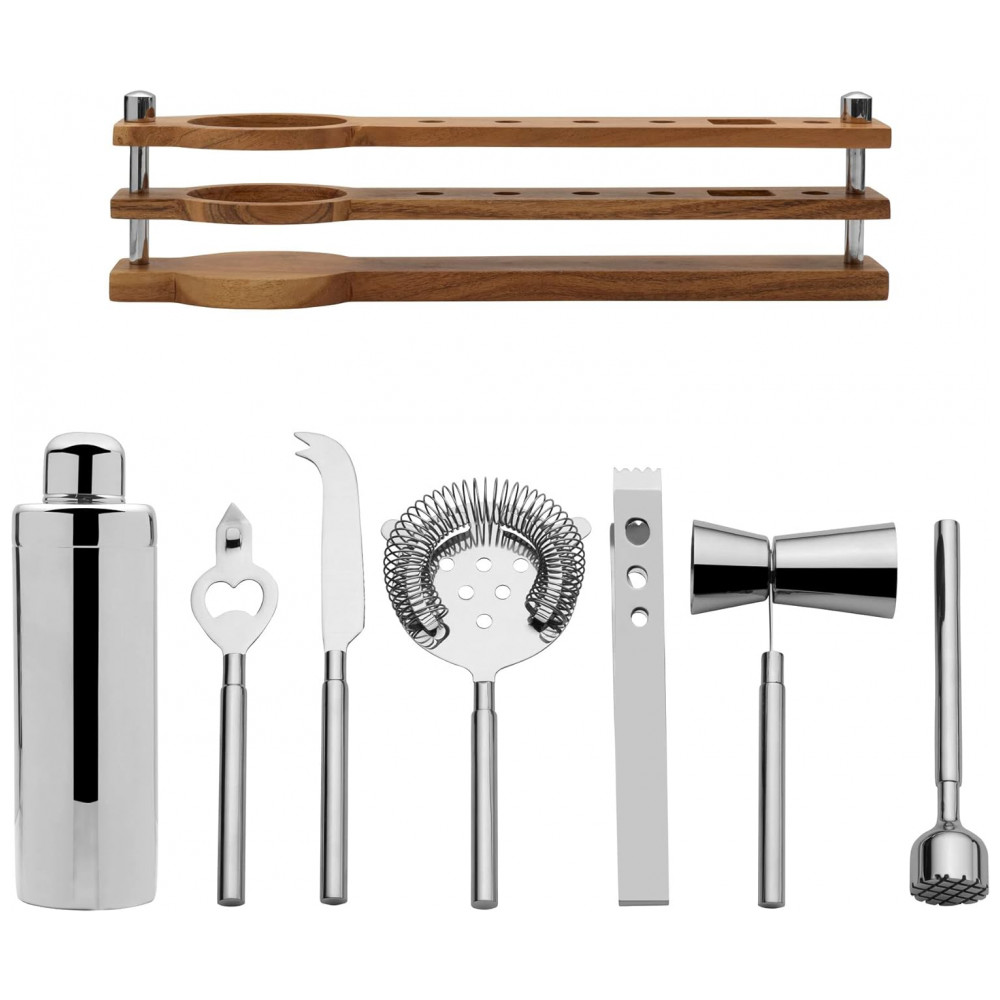Kit Bartender Profissional 8 Peças em Aço Inoxidável com Suporte de Madeira Mikasa Prata