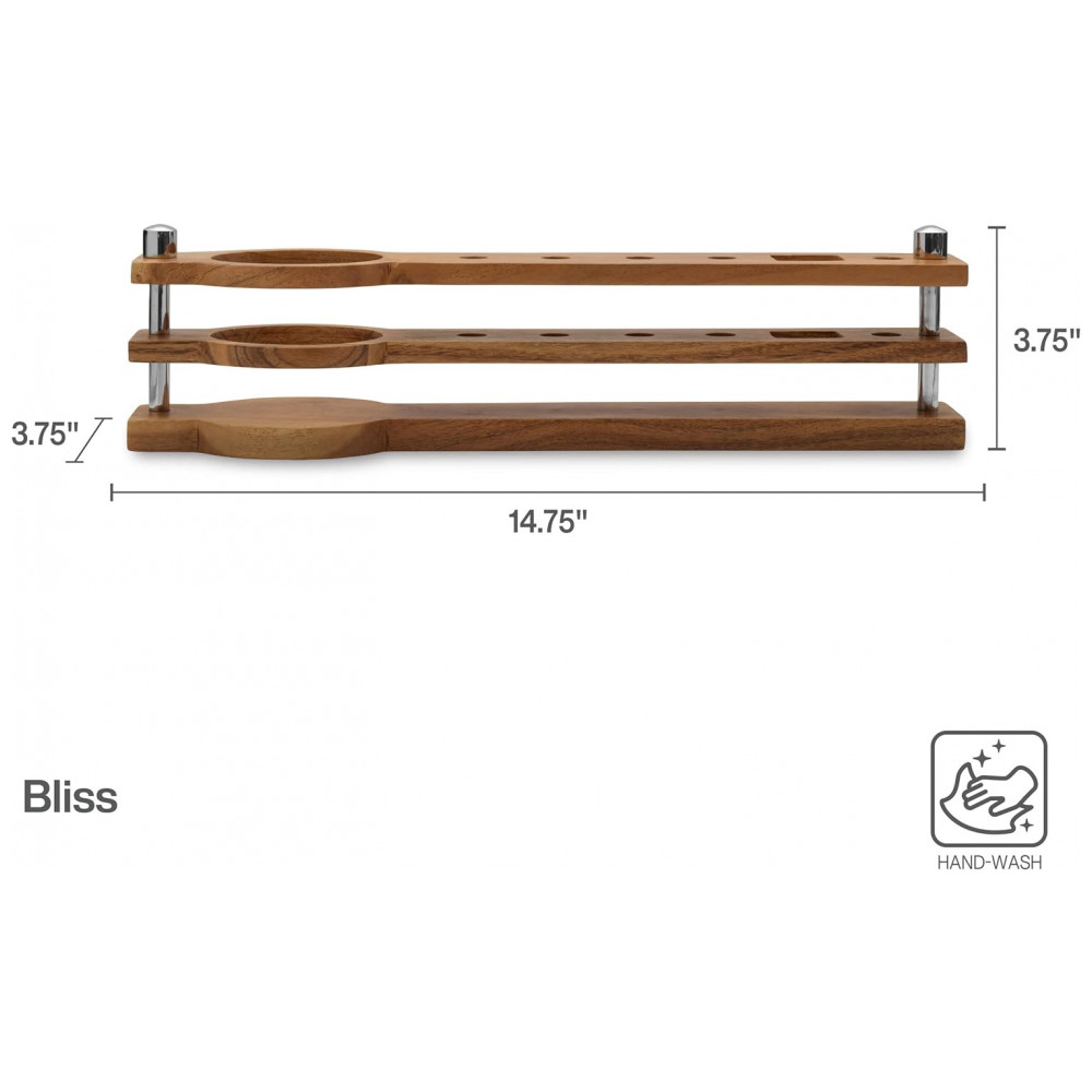 ACESSÍVEL E ORGANIZADO o elegante suporte em madeira de acácia apresenta um design moderno com compartimentos para todas as ferramentas, para que estejam sempre organizadas e ao seu alcance.