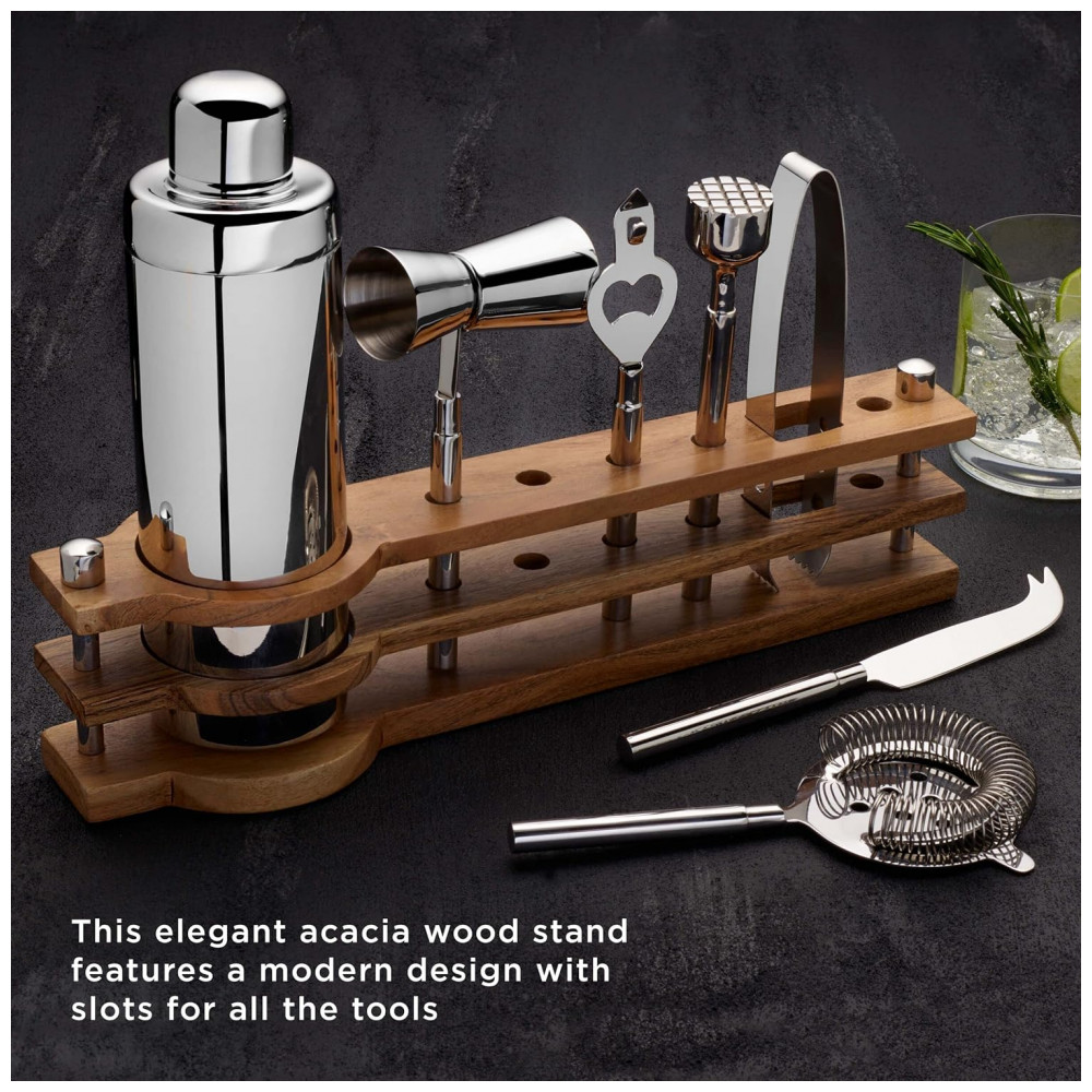CONJUNTO DE BARRAS TUDO EM UM inclui um agitador, levantador de tampas, faca de bar, coador, macerador, pinça de gelo e um jigger duplo em um suporte de madeira de acácia, tornando este conjunto ideal para o seu bar em casa.