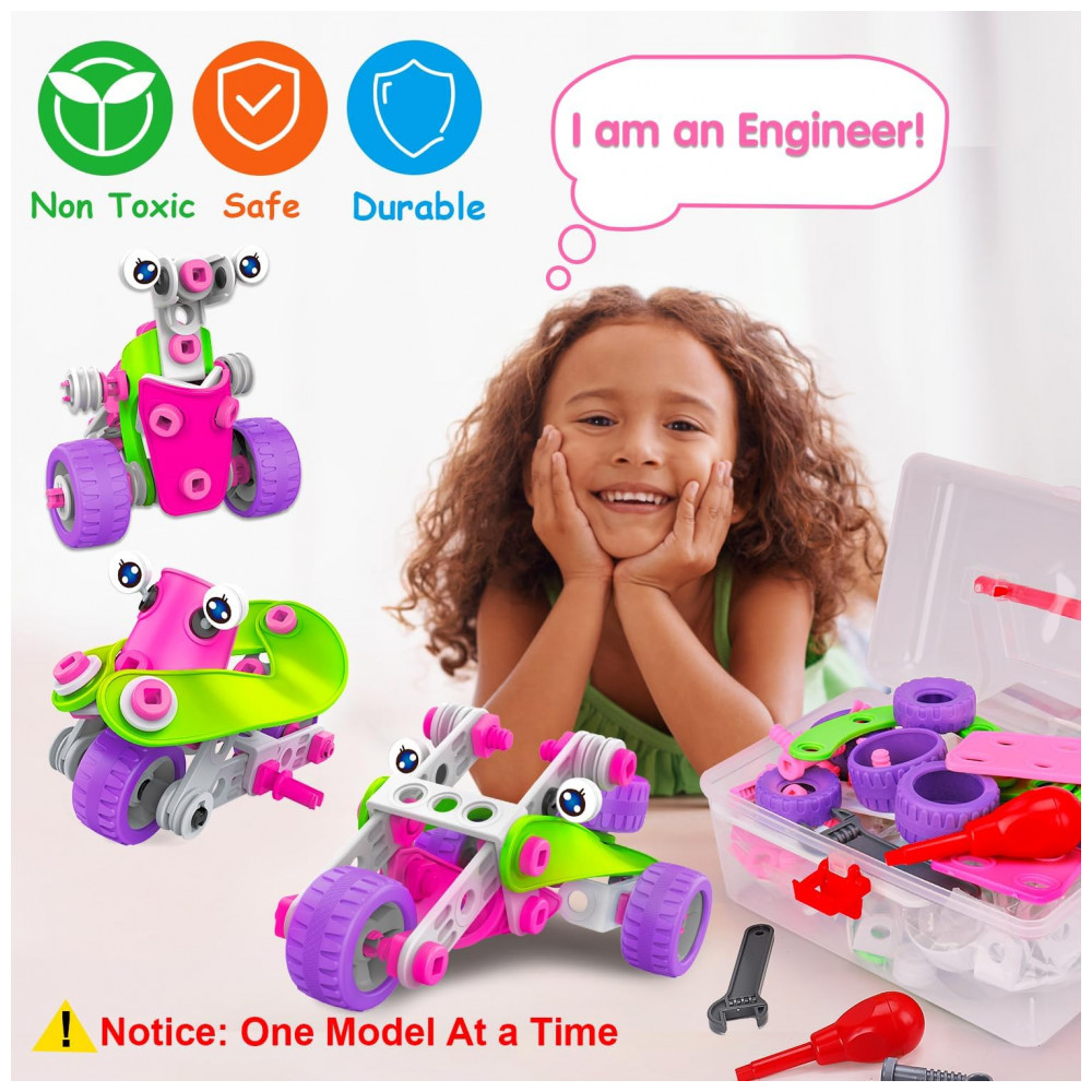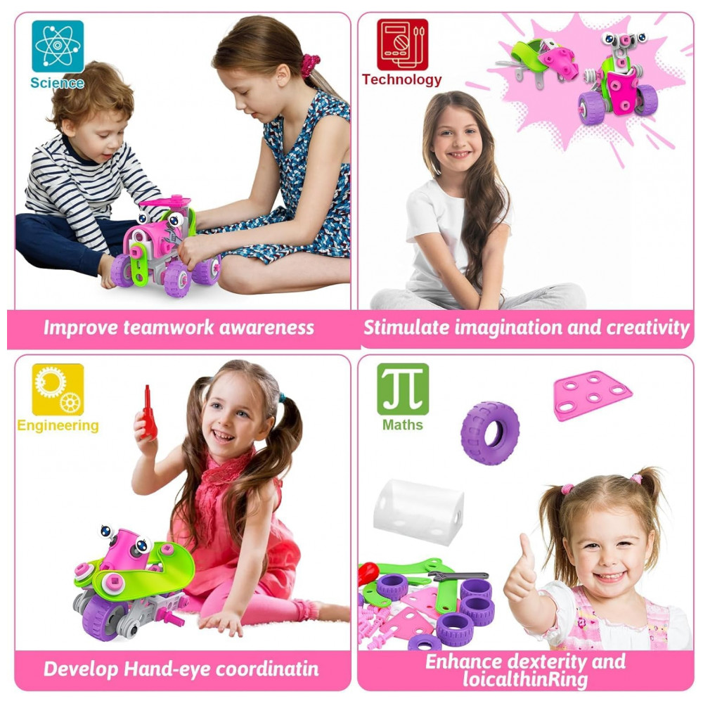 O kit de construção STEM Tsomtto rosa 14 em 1 é um conjunto de blocos e conectores que permite montar diferentes modelos como carrinho, avião, carro de corrida, carro de equilíbrio, trem, robô, flor, cadeira, cama e outras estruturas. As peças são projetadas para encaixe mecânico simples, possibilitando que a criança siga o manual ilustrado para montar um modelo por vez ou combine elementos para criar estruturas próprias. O conjunto é voltado para atividades de engenharia inicial, raciocínio espacial e construção criativa em ambiente doméstico ou escolar.