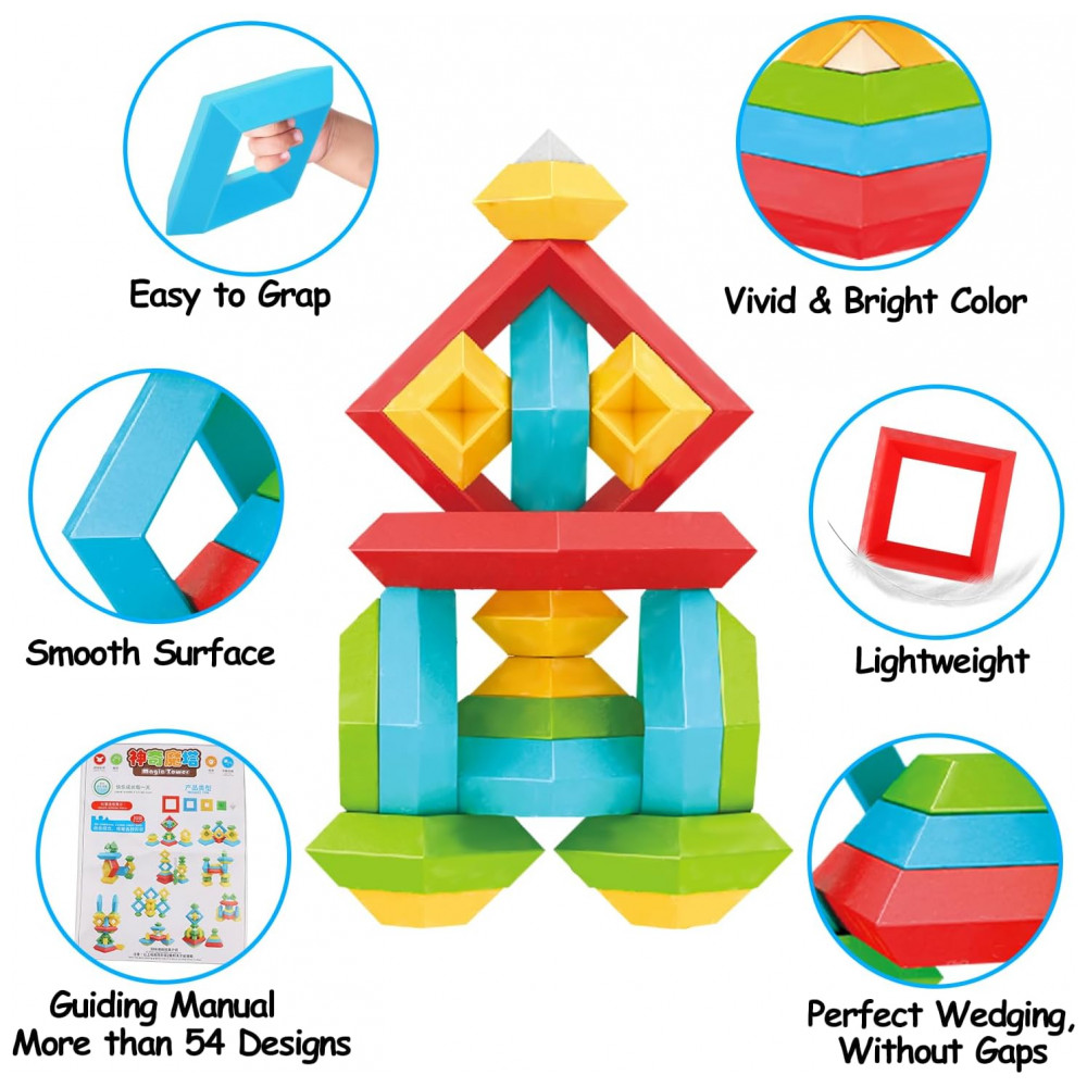 O kit Montessori de blocos de empilhar Tsomtto é um conjunto de construção composto por 30 blocos plásticos em diferentes cores, formas e tamanhos, projetado para atividades de empilhamento, encaixe e criação de estruturas geométricas. O conjunto permite seguir modelos de montagem sugeridos no manual, com dezenas de combinações possíveis, ou criar construções livres, explorando equilíbrio, altura, alinhamento e composição de figuras. As peças são produzidas em plástico leve e resistente, com acabamento liso e bordas arredondadas, dimensionadas para o manuseio por crianças em idade pré-escolar.