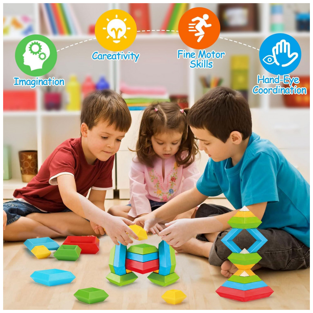 Os blocos de empilhar favorecem o desenvolvimento da coordenação motora fina e do controle de movimento ao posicionar e equilibrar as peças em diferentes direções e alturas. O kit também estimula percepção visual, reconhecimento de cores e formas, raciocínio espacial, planejamento e resolução de problemas, especialmente ao tentar reproduzir modelos propostos ou criar construções estáveis.