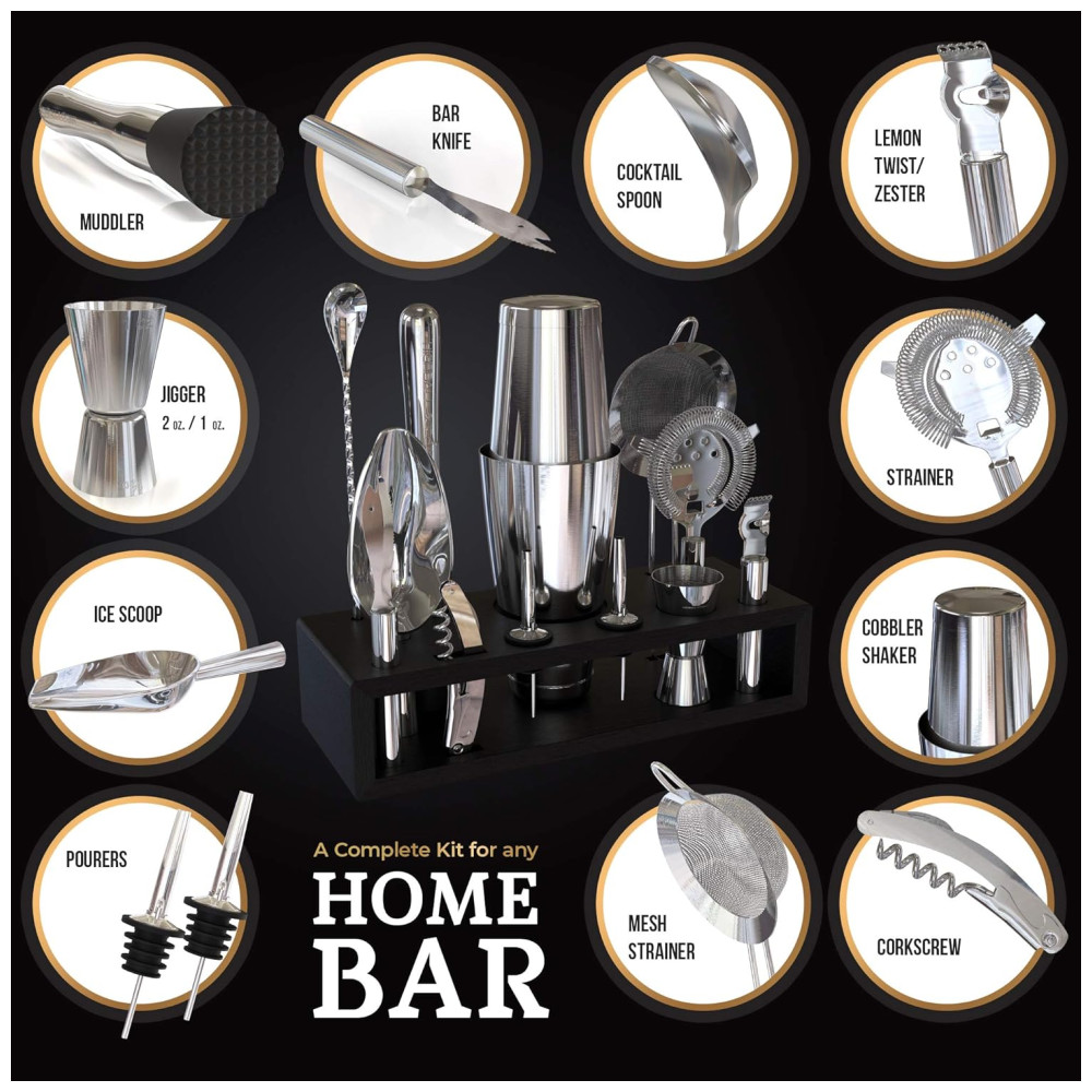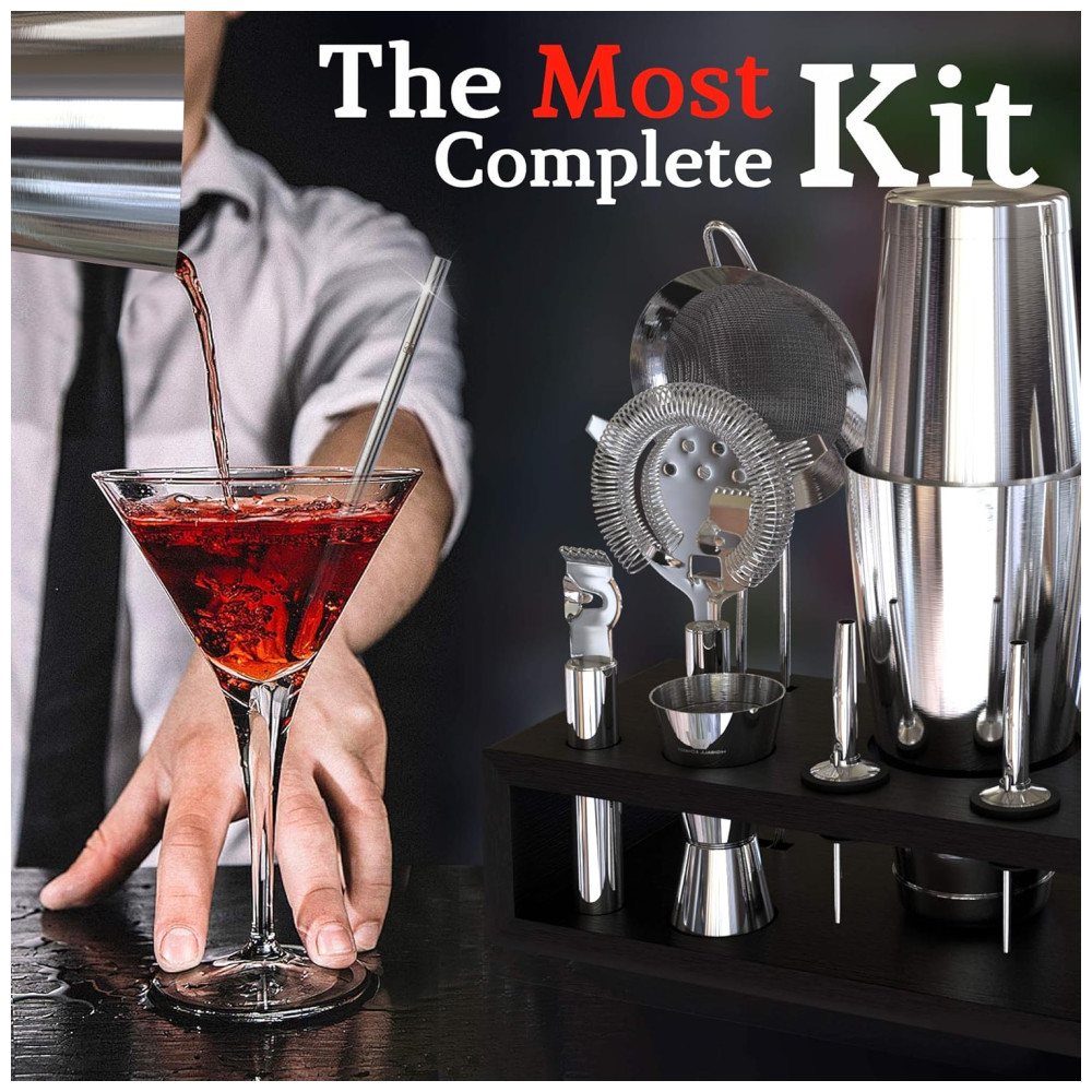CONJUNTO DE BARRAS MAIS COMPLETO DISPONÍVEL Não se contente com um conjunto de barras incompleto. O nosso inclui uma faca de barra para cortar limões e limas, um zester de limão com uma faca de canal recém projetada para criar facilmente torções de limão e lima e uma peneira de malha fina para manter toda a espuma e polpa fora dessas belas bebidas diretas.
