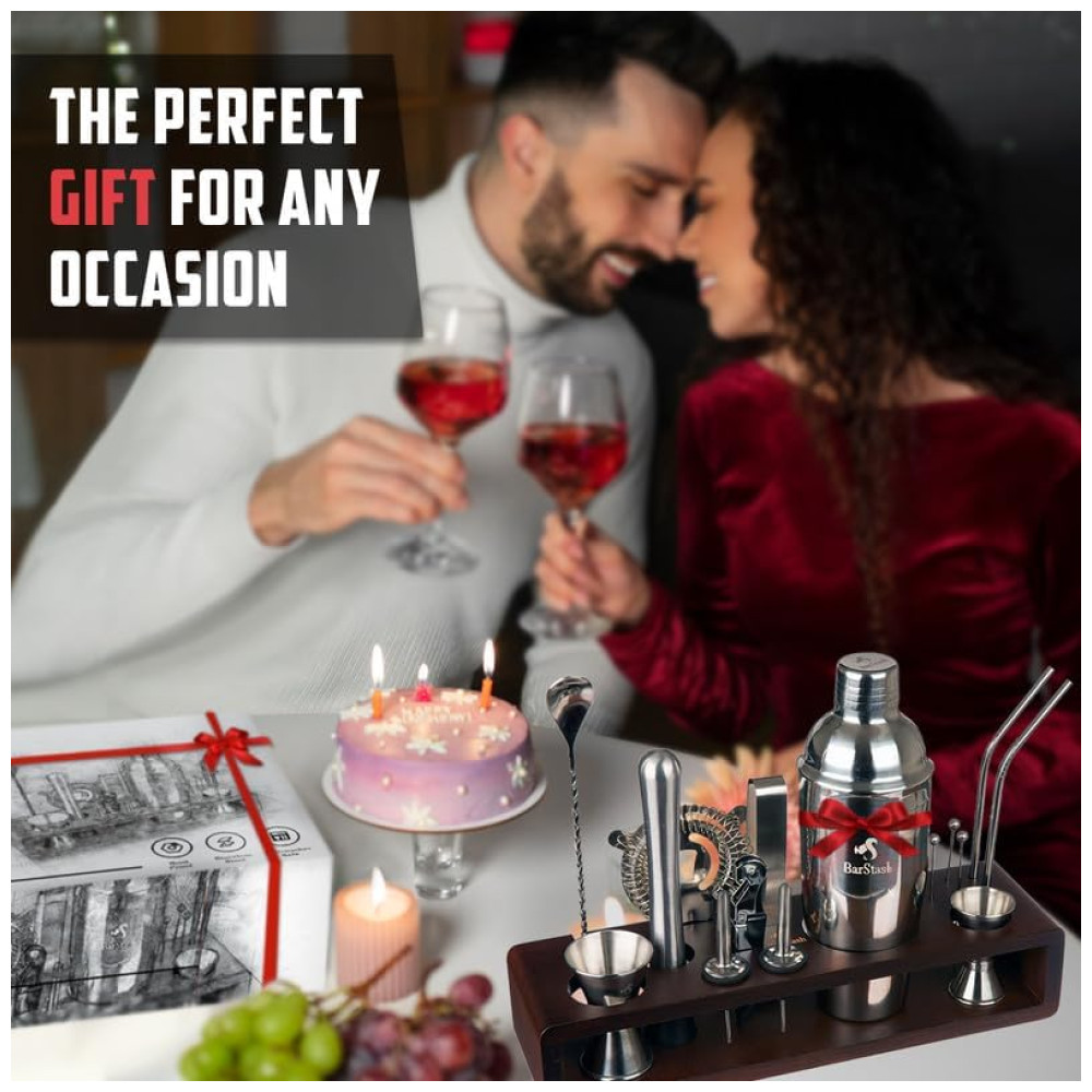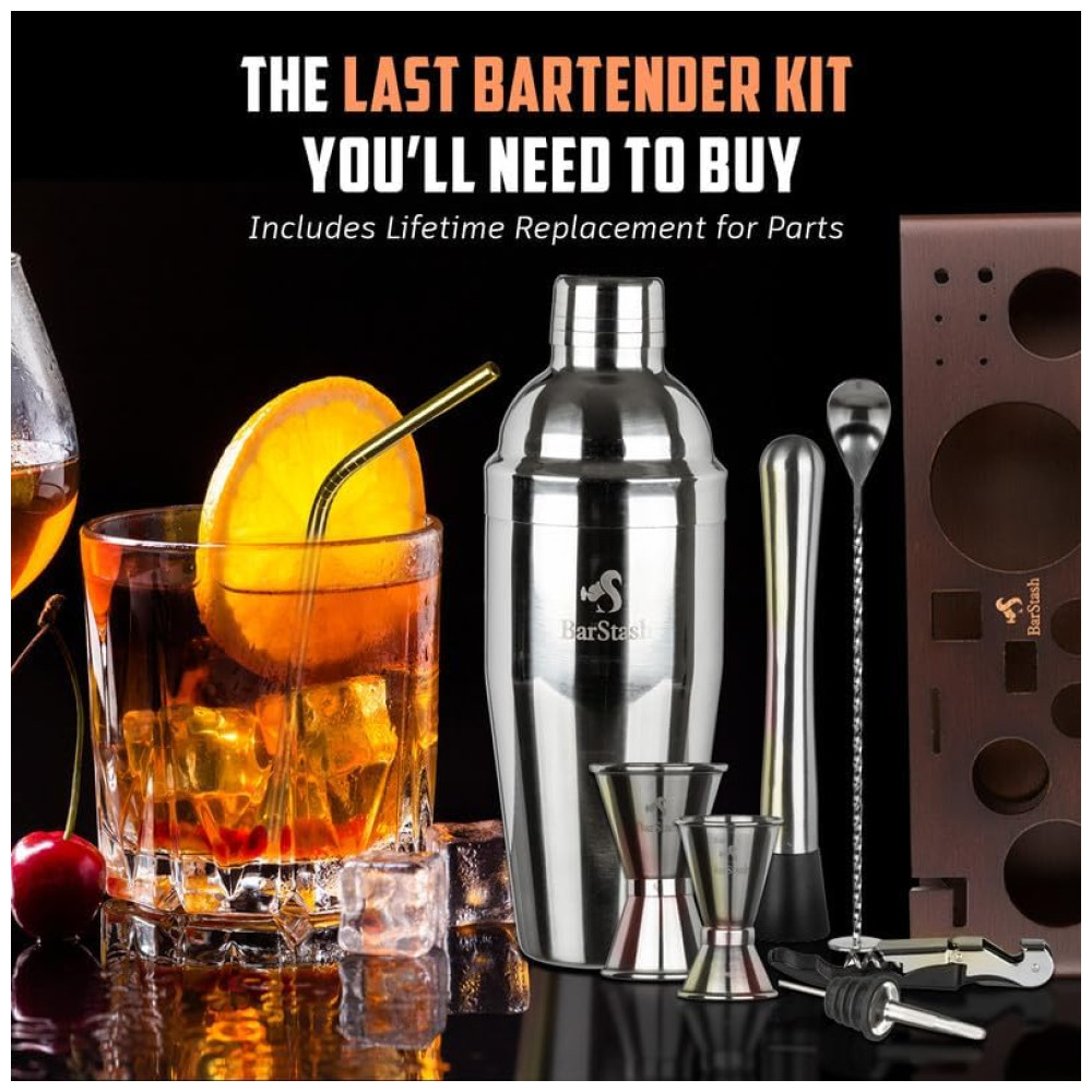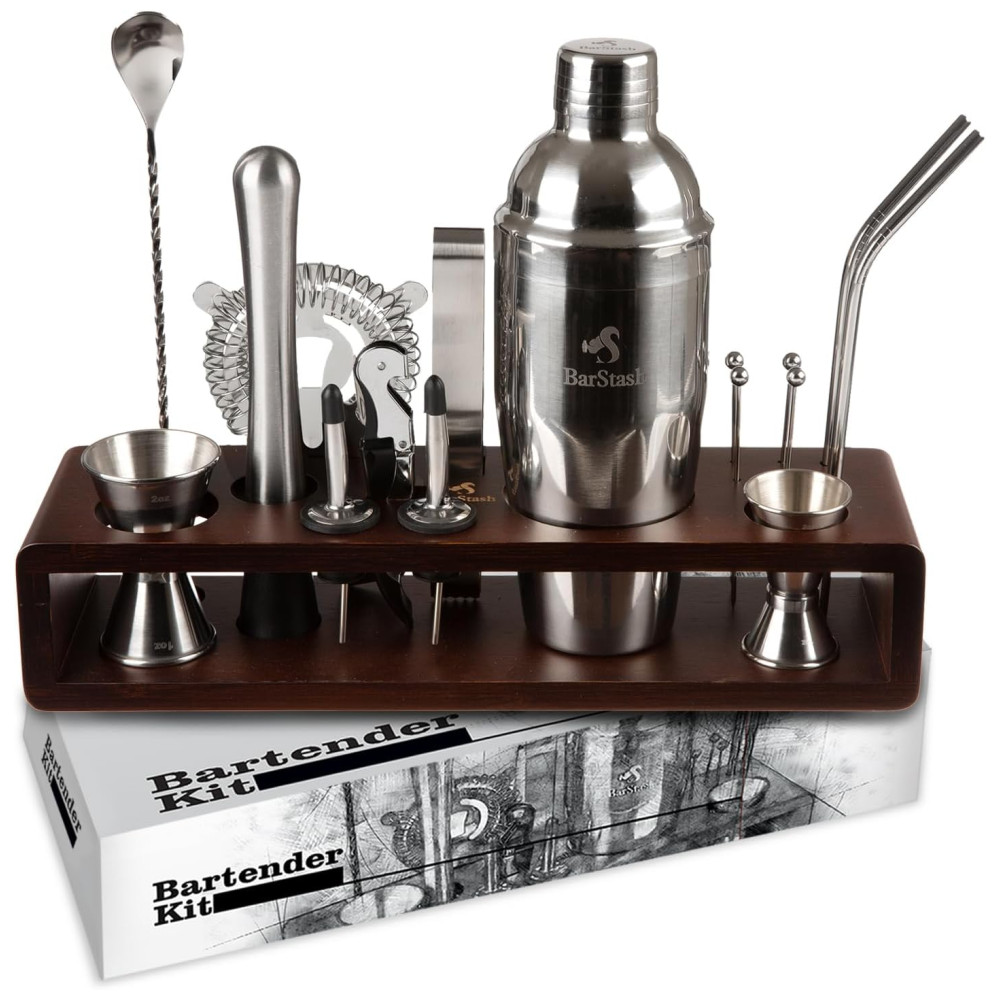 O PRESENTE PERFEITO EXISTE O kit de bartender BarStash é o kit de bartender perfeito para qualquer casa. Nosso conjunto de 17 peças oferece as ferramentas de bartending mais populares e amplamente utilizadas, organizadas perfeitamente em um elegante suporte de bambu.