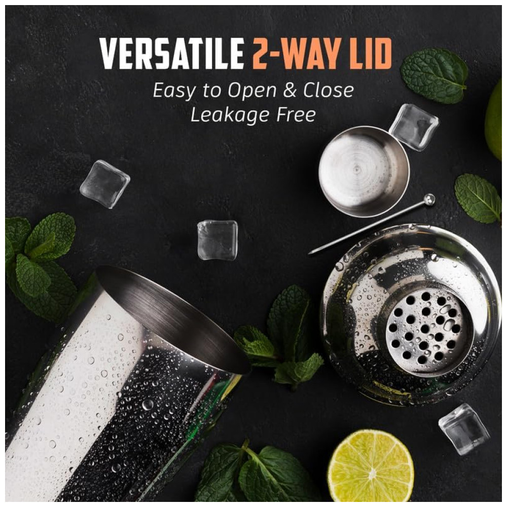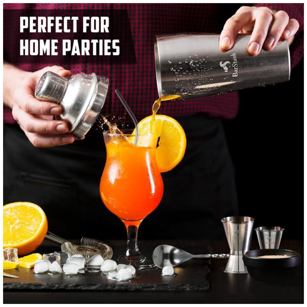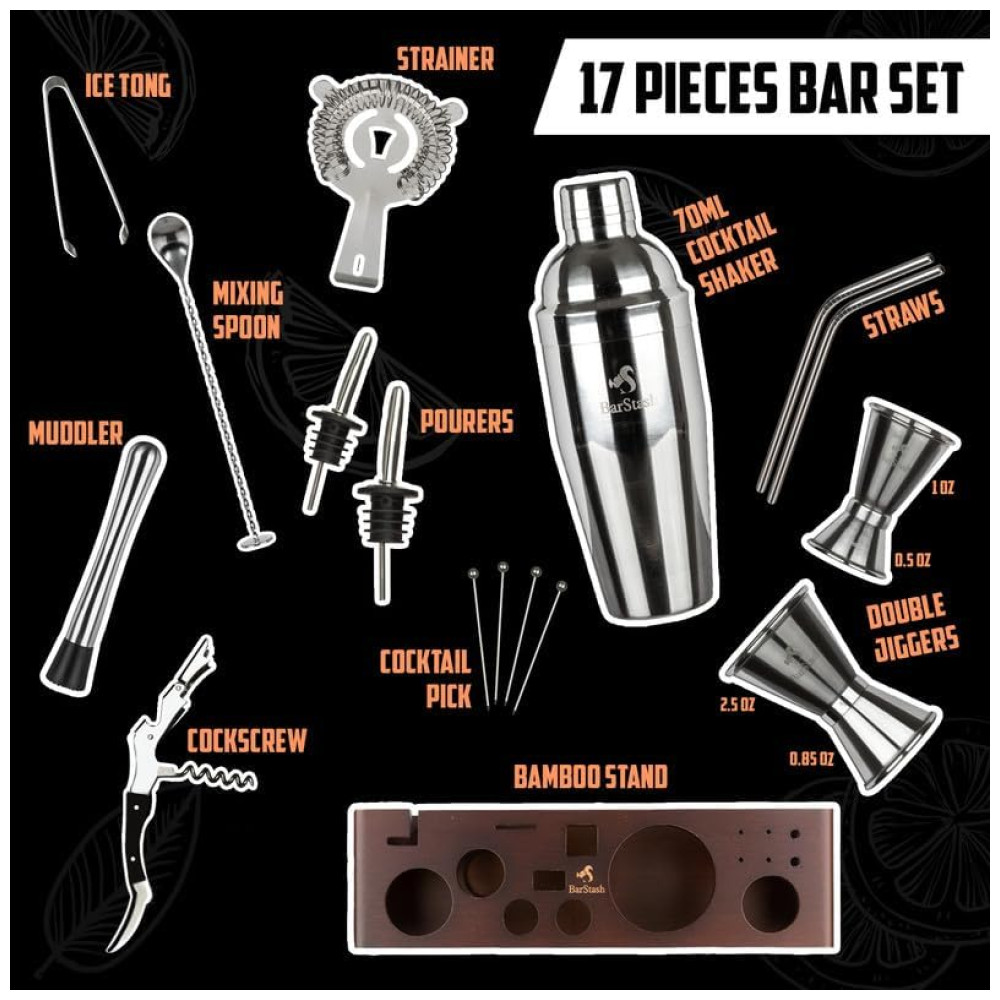 TUDO O QUE VOCÊ PRECISA EM UM CONJUNTO Este conjunto de 17 peças inclui 2 Jiggers, um Pourer, Pick, Palha Inoxidável, Coqueteleira 700ml, Colher de Mistura, Muddler, Coador, Pinça de Gelo, Saca rolhas e nosso Suporte de Bambu de Alta Qualidade, com nosso e book de receitas incluído