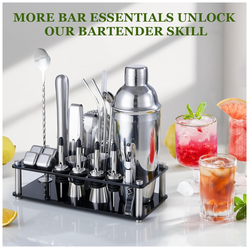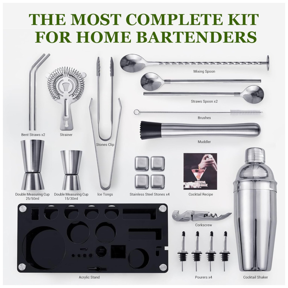 Conjunto de 23 unidades para coquetel Kit de bn KINGROW, um conjunto para atender a todas as suas necessidades Kit de ferramentas de bar. Consiste em um conjunto de latas agitadoras de 25 onças, 4 pourers, copo duplo de medição 15 , 30ml e 25 , 50ml, uma pinça de gelo, um barulhento, 2 colheres de canudos, 2 canudos dobrados, um saca rolhas, pincéis, uma colher de mistura, 4 Pedras de Aço Inox, uma Receita de Coquetel, um Clipe de Pedras, um Coador, um Suporte de Acrílico, E tem um guia de receitas exclusivo, que facilita o uso para iniciantes.