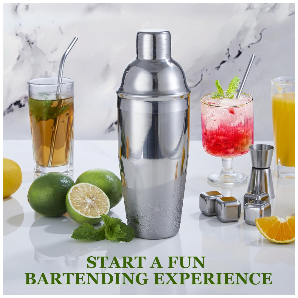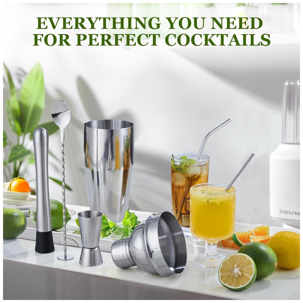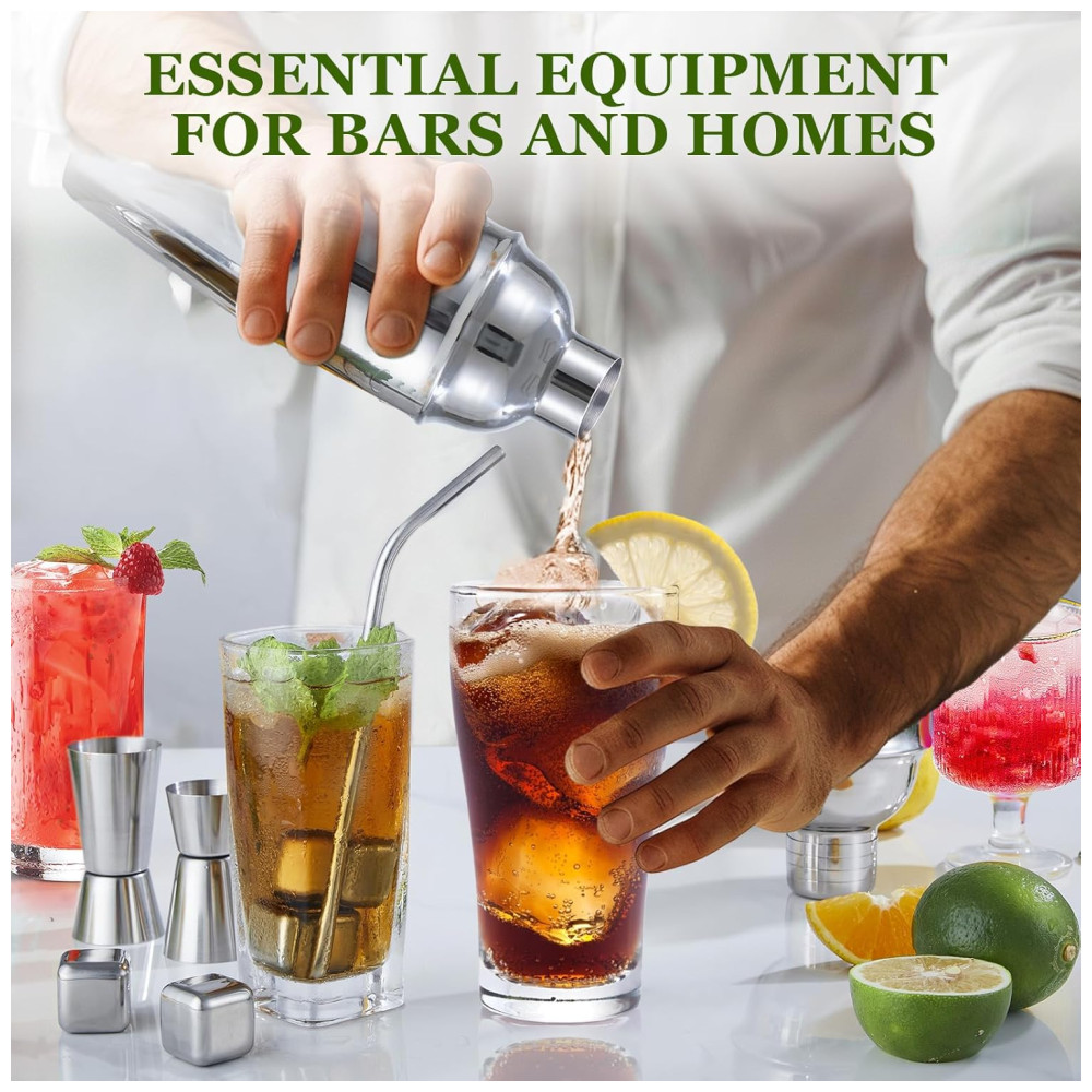 Material de aço inoxidável premium O conjunto coqueteleira é feito de aço inoxidável 304 de alta qualidade. Inofensivo para a saúde, é durável, à prova de vazamentos, leve e não riscável, à prova de ferrugem e resistente a arranhões, não deformado e fácil de limpar. O conjunto de ferramentas para cocktail shaker é muito fácil de limpar manualmente com água morna e sabão e manter seu brilho com facilidade, adicionando arte moderna ao seu bar doméstico.