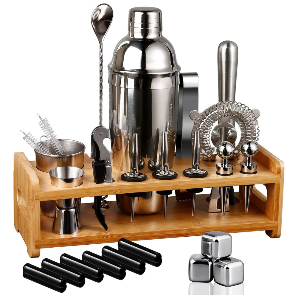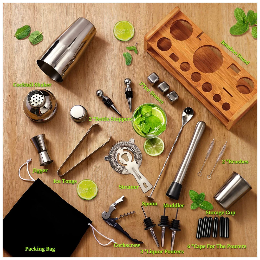Um pacote inclui tudo que você precisa Nosso conjunto de ferramentas de bar de coquetéis inclui produtos de 26 unidades Coqueteleira, Suporte de bambu, Muddler para serviços pesados, Colher de mistura, Jigger, Saca rolhas, 2pcs escovas, pinças de gelo, filtro, copo de zenamento, 2pcs rolhas de garrafa, 6pcs caps para os despejadores, 3pcs Whisky Ice Stones, 3pcs Licor Pourers e um saco de embalagem.