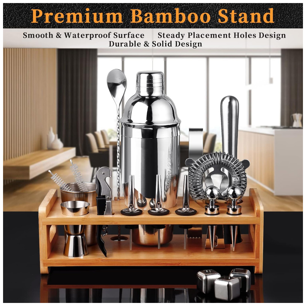 Design conveniente e bela aparência Este tipo de kit de coquetel com suporte parece atraente, sofisticado e elegante. Possui um design único, e o Bamboo Stand é fácil de limpar e você pode colocar seu coquetel acessórios nele, é s tão conveniente e limpo. Além disso, fornecemos uma bolsa de veludo para você, você pode usá la para tornar o produto mais fácil de transportar.