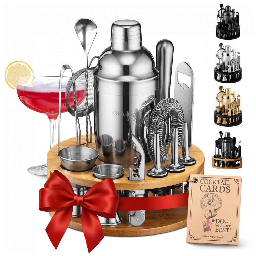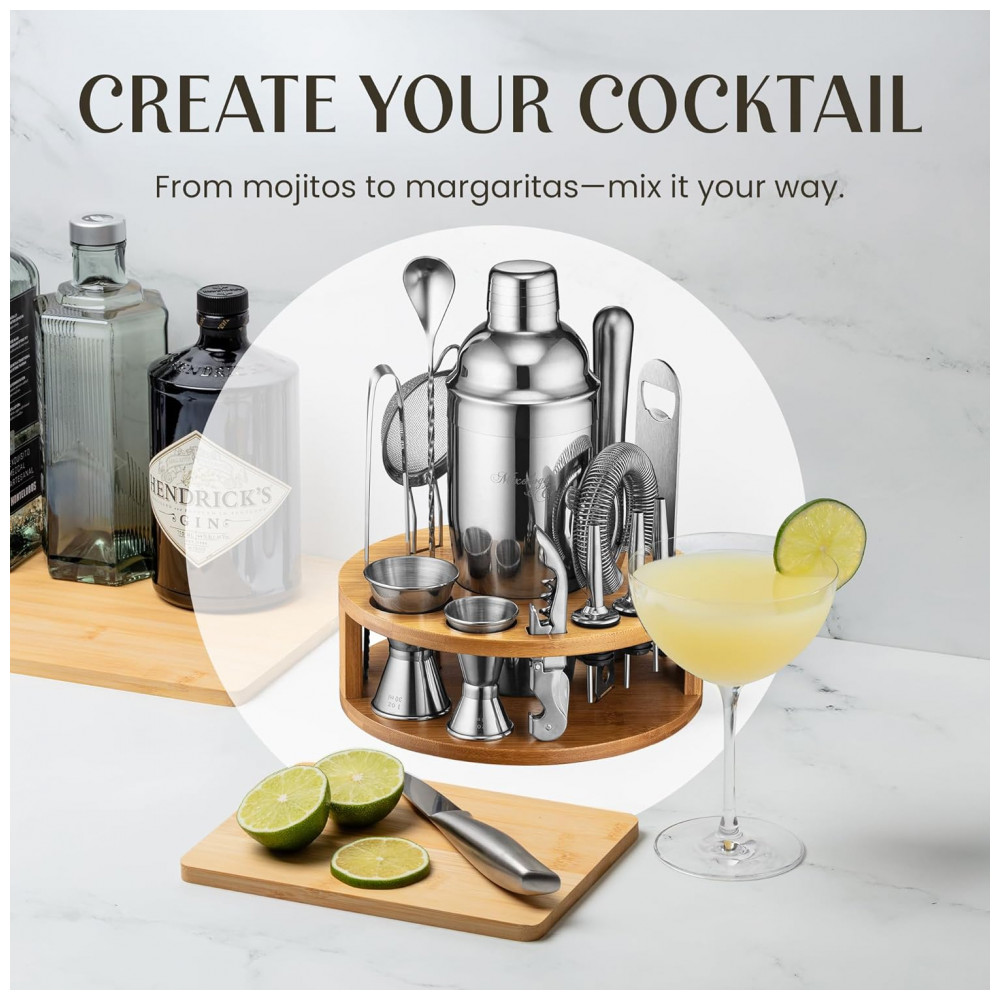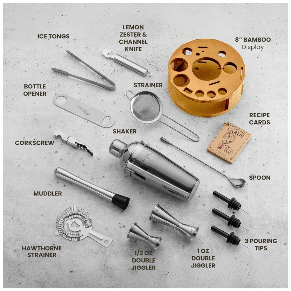 O conjunto de barras de 15 peças inclui um shaker de martini com um filtro embutido, mojito muddler e muito mais. Nenhuma experiência atrás do bar é necessária