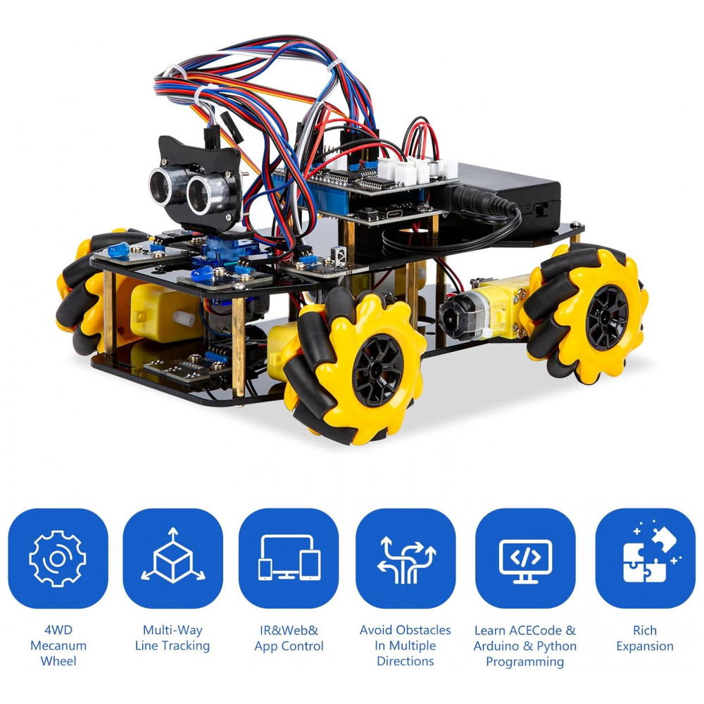 O ACEBOTT QD001 é um kit de carro robô 4WD com rodas mecanum, voltado para iniciantes em robótica e programação a partir de 12 anos, baseado em placa ESP32. Ele permite implementar movimento omnidirecional (frente, lateral, diagonal, giro), múltiplas rotas de linha, desvio de obstáculos em diferentes direções, controle por app, controle remoto infravermelho e interface web, com 16 tutoriais em formato de histórias que introduzem programação e princípios de hardware eletrônico.