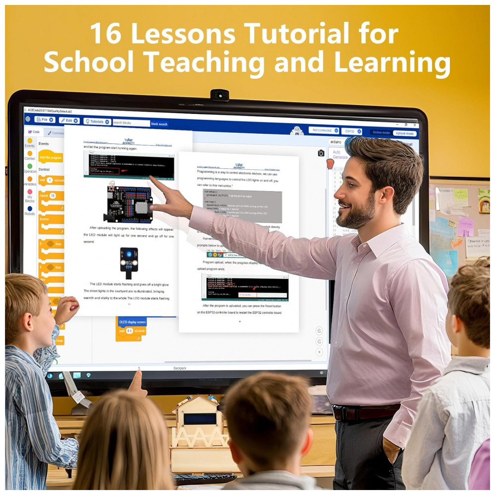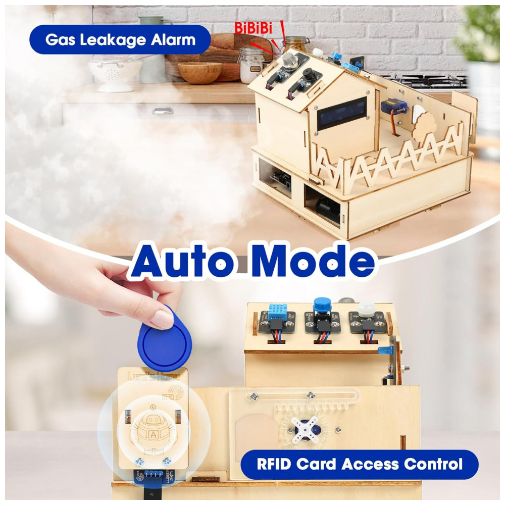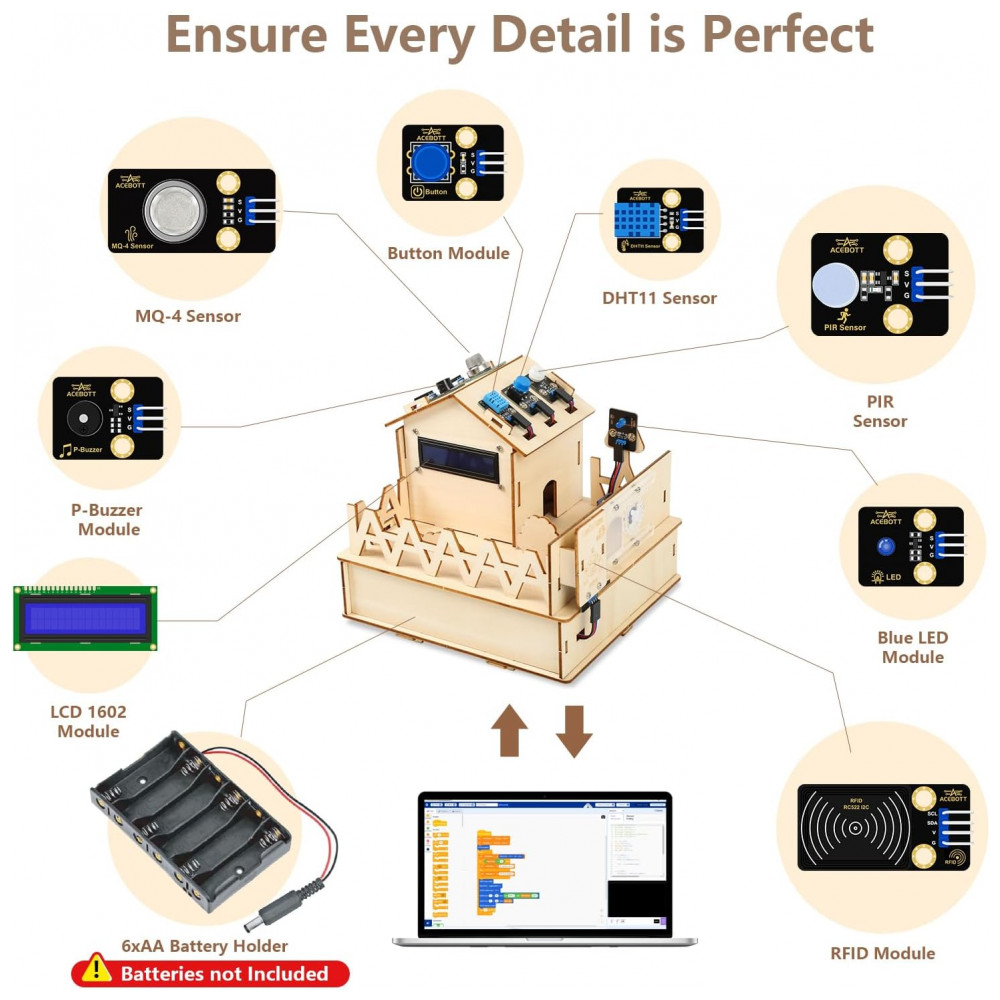 O ESP32 IoT Smart Home Starter Kit ACEBOTT QE004 é um kit educativo de casa inteligente baseado em placa ESP32, projetado para ensino de eletrônica, programação e Internet das Coisas por meio de um modelo de casa em madeira 3D com múltiplos sensores e atuadores. O conjunto integra módulos como LEDs, buzzer passivo, RFID, display LCD, botão, sensor de gás, sensor infravermelho de presença, sensor DHT11 de temperatura e umidade, placa de comunicação sem fio ESP32 e servos, permitindo implementar funções de automação, monitoramento e controle em um cenário de smart home. As estruturas em plywood ecologicamente correto utilizam templates de corte 3D, com peças etiquetadas e de montagem direta, que podem ser personalizadas com pintura e expostas como maquete de estudo.