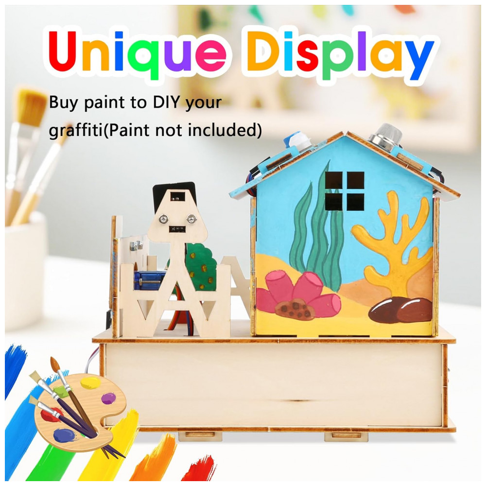 Conteúdo da caixa: Estruturas em madeira 3D para casa, placa ESP32, sensores, módulos, servos, cabos e acessórios de montagem