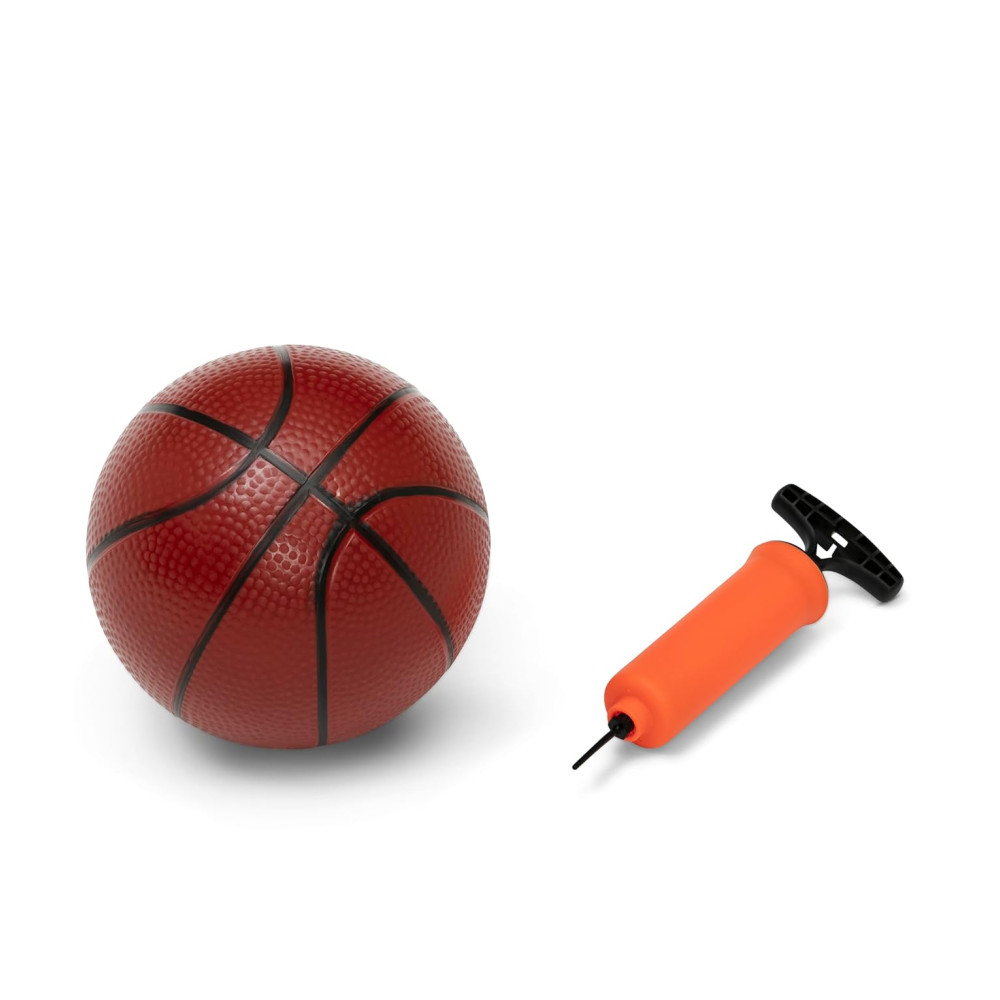 O conjunto inclui uma cesta de basquete, uma bola de basquete e uma bomba de ar manual. As dimensões montadas são de 40 x 38 x 160 cm na configuração de altura mais alta. Recomendado para crianças a partir de 3 anos.