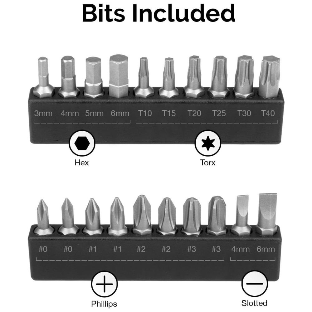 VALOR Inclui estojo de zenamento e 20 bits destacáveis Phillips 2 x 0, 1, 2, 3, com fenda 2 x 4,, Torx T10, T15, T20, T25, 0, T40 e Hex 3,4,5,