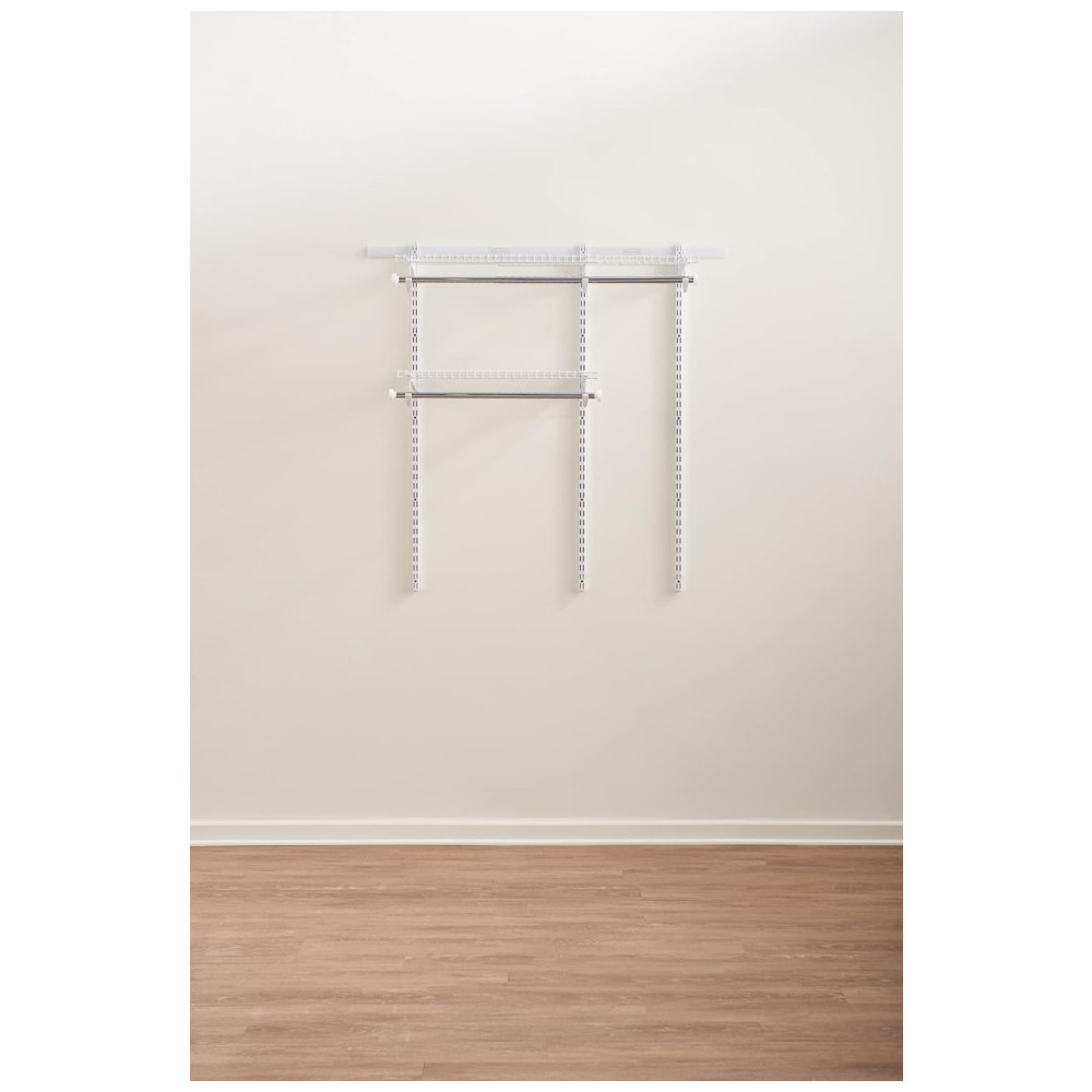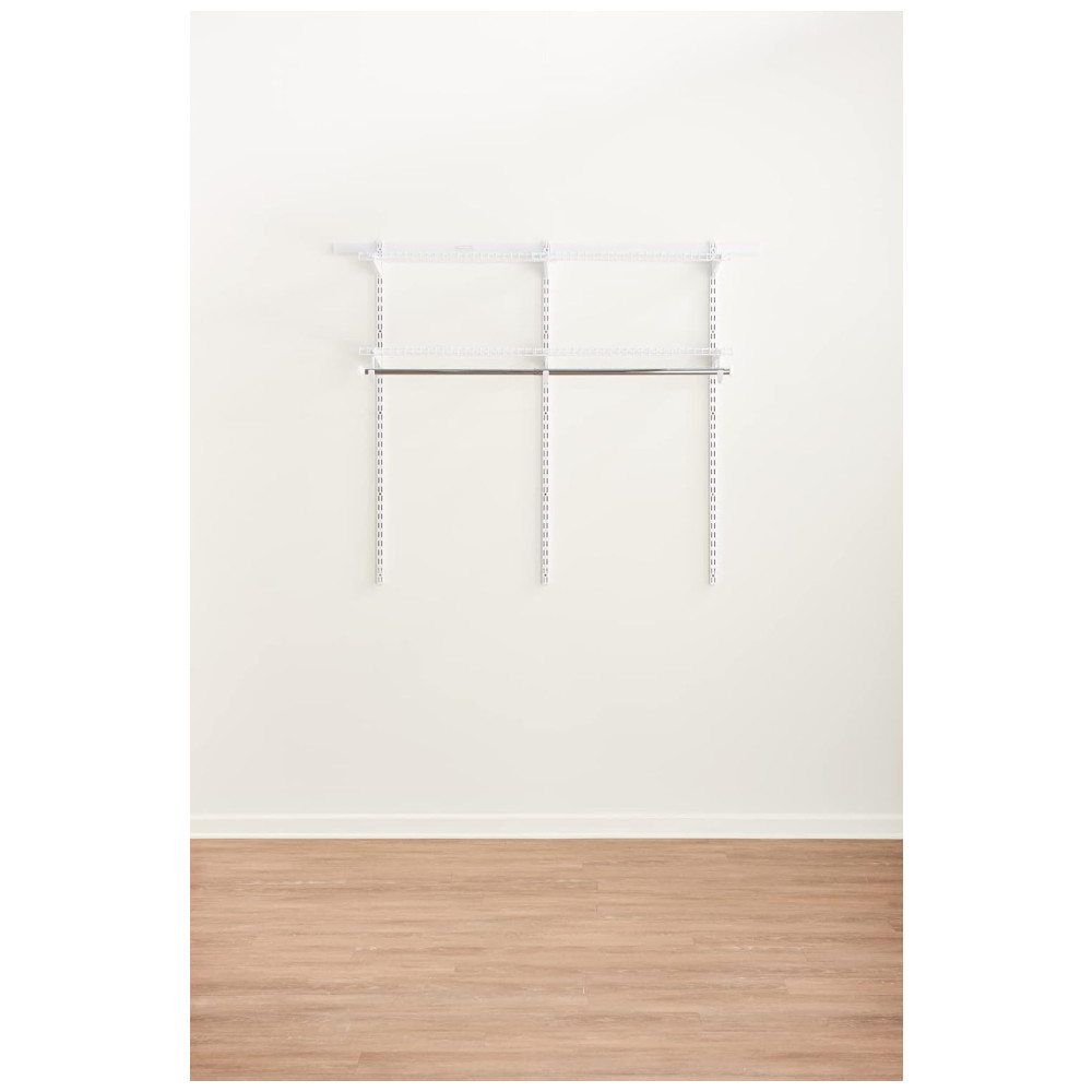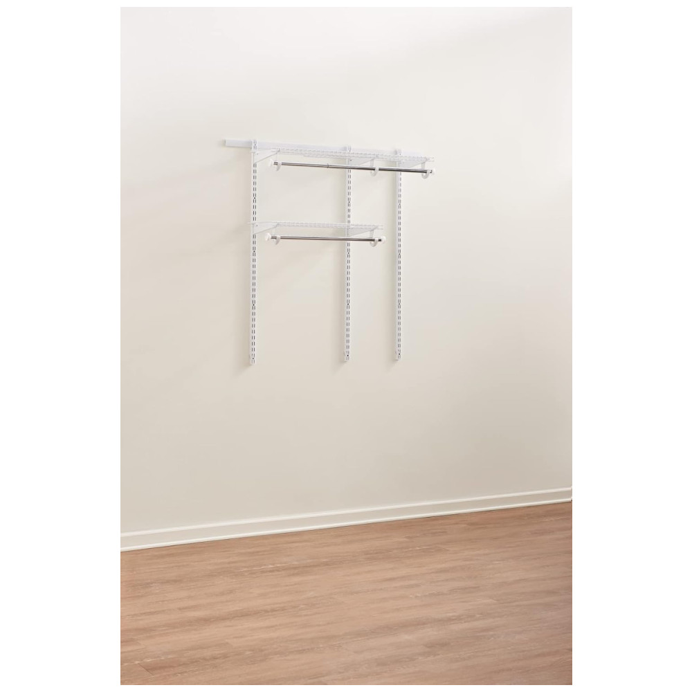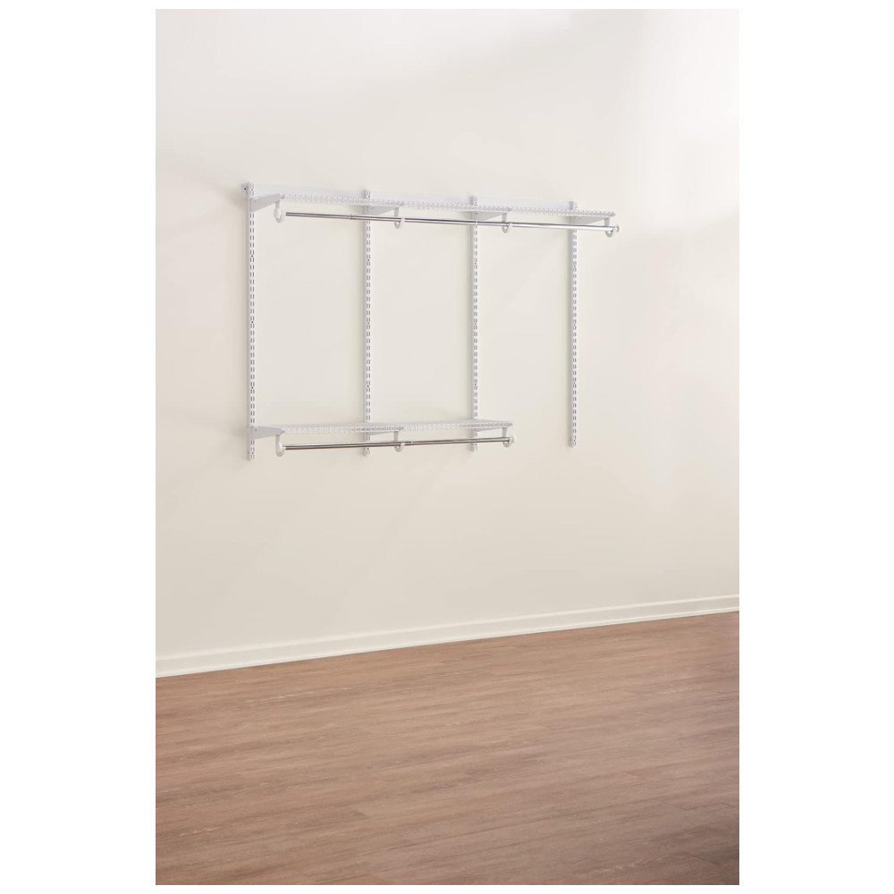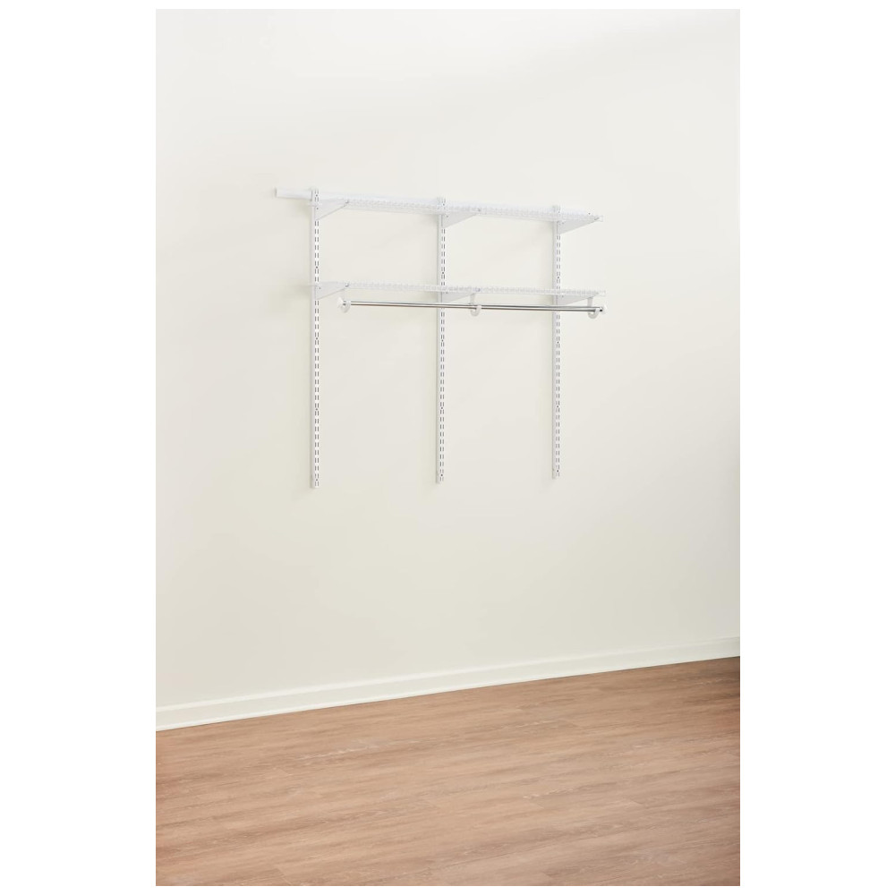 O kit de armário inclui 3 Prateleiras de aproximadamente 60,96 centímetros, 2 Prateleiras de aproximadamente 91,44 centímetros, 2 Hastes telescópicas de aproximadamente 66,04 centímetros, 2 Hastes telescópicas de aproximadamente 91,44 centímetros, 2 trilho suspenso de aproximadamente 60,96 centímetros, 3 tampas do trilho, 10 suportes, 4 trilhos, Extensões verticais de aproximadamente 63,5 centímetros e 8 suportes de haste suspensa