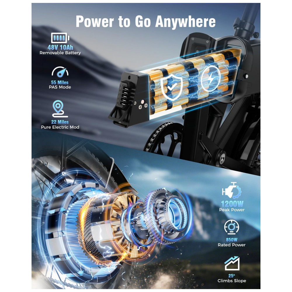 Cada unidade do kit é equipada com motor traseiro com potência de pico em torno de 1200W, alimentado por bateria de íons de lítio de 48V e 10Ah, com energia total combinada de aproximadamente 864Wh para o conjunto das duas bicicletas (cerca de 432Wh por unidade). A bateria é removível e possui certificação UL, oferecendo autonomia em torno de 55 km em modo de assistência ao pedal, variando conforme o relevo, o modo de uso e o peso do ciclista.