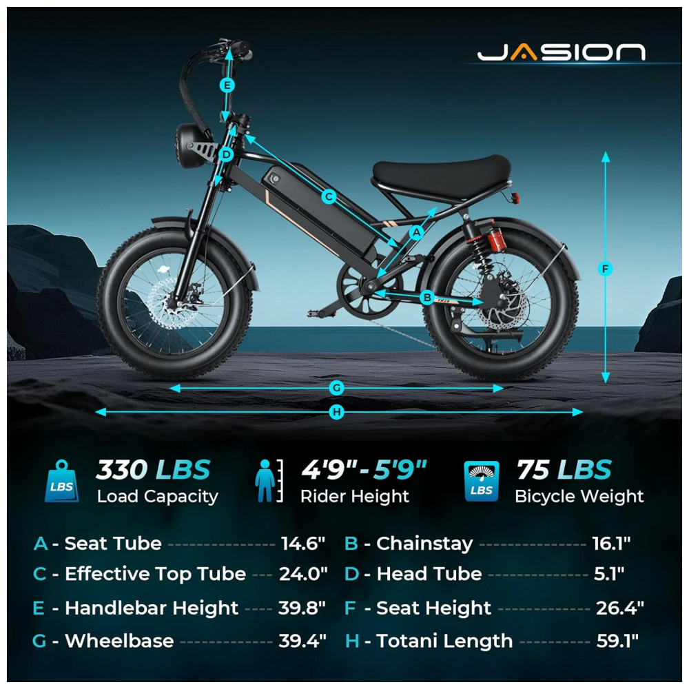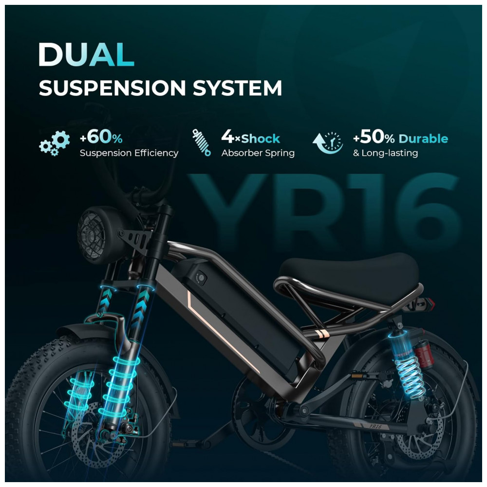 O kit com 2 bicicletas elétricas Jasion YR16 na cor preto stealth é voltado para adolescentes e adultos que buscam um conjunto de e-bikes compactas estilo dirt/moped para deslocamentos urbanos, uso recreativo em estradas de cascalho e trilhas leves. Cada bicicleta utiliza quadro em aço carbono, pneus fat 16×4 e suspensão dupla, oferecendo boa estabilidade, absorção de impactos e aderência em diferentes tipos de terreno. As duas unidades compartilham as mesmas características técnicas, permitindo uso em conjunto por famílias, casais ou grupos que necessitam de mobilidade elétrica similar.
