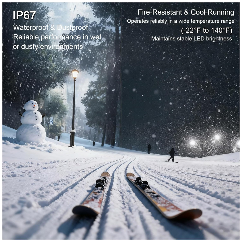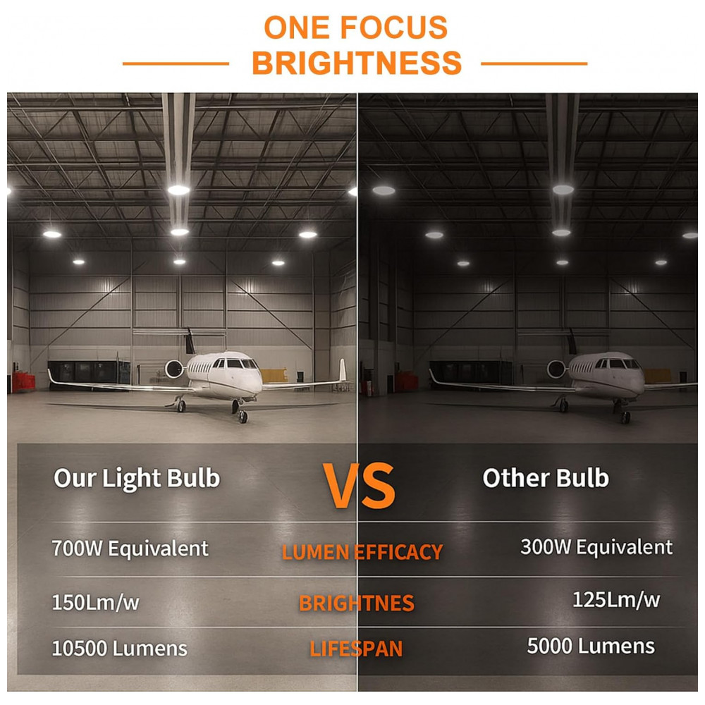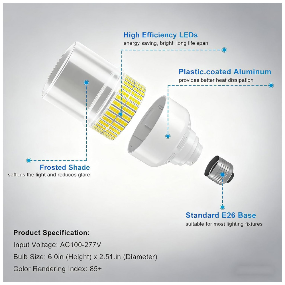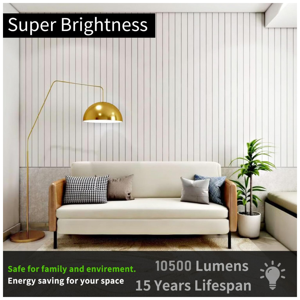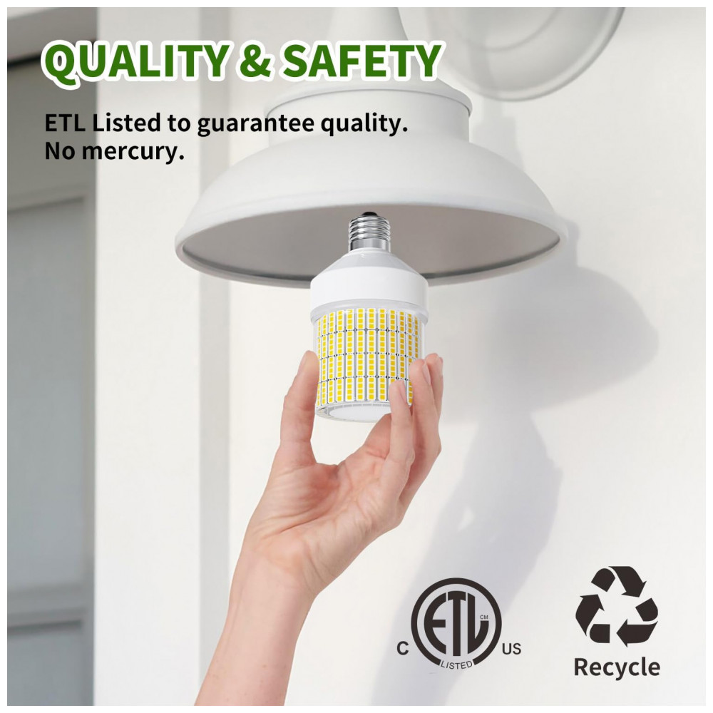 A Lâmpada de Milho de LED NS oferece uma economia de energia impressionante de 90% em comparação com lâmpadas tradicionais de 500W de Halogênio Metálico e 700W incandescentes, mantendo o mesmo nível de brilho. Com alta luminosidade, produz até 10500 lumens com ângulo de feixe de 360 graus, iluminando uma área ampla. Possui um índice de reprodução de cor (CRI) de 80 para cores naturais e vibrantes, criando um ambiente confortável e esteticamente agradável em sua casa. Compatível com bases E26 e E39, é fácil de instalar, adequada para AC100-277Vac. Com uma vida útil de até 35000 horas, graças ao seu design de dissipação de calor isolado, evite o contato direto com o corpo da lâmpada enquanto estiver ligada ou desligada. Com temperatura de cor de 5000K, é ideal para diversos ambientes comerciais e residenciais, como restaurantes, garagens, armazéns, oficinas, supermercados, porões, fábricas e academias, entre outros.