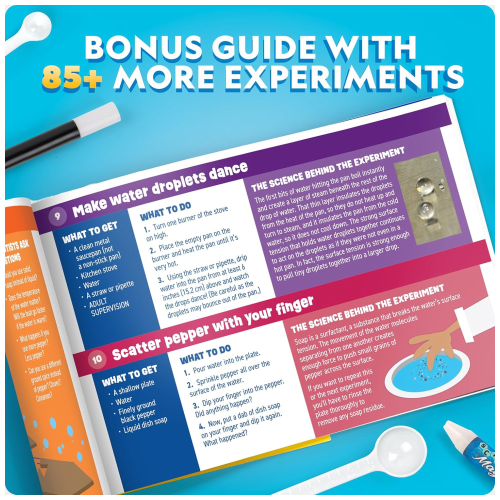ATÉ O GUIA DE EXPERIÊNCIA É INCRÍVEL Nosso guia de experimentos único ilustrou instruções para crianças, bem como insights sobre a ciência que cria a magia, técnicas usadas por cientistas reais e muitos fatos fascinantes