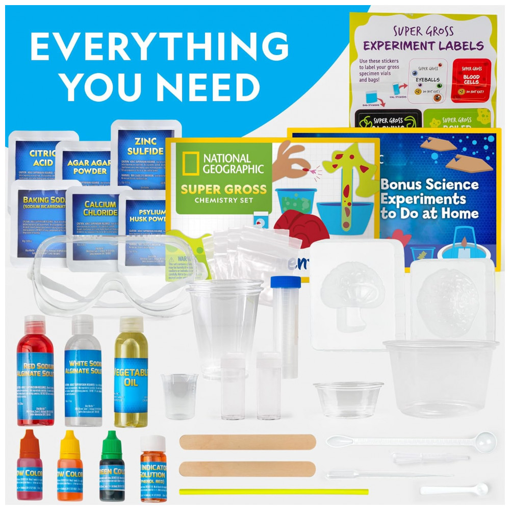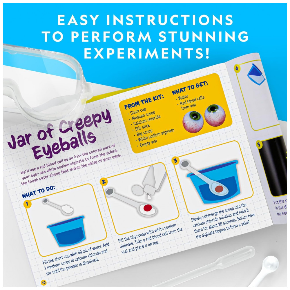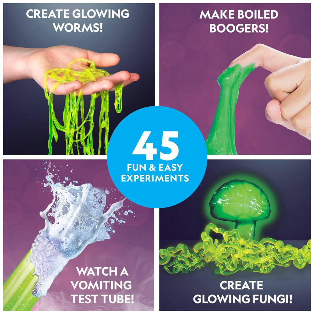 SUPER BRUTO SIGNIFICA SUPER DIVERTIDO Os kits científicos são muito mais divertidos quando os experimentos incluem ferver melecas, criar minhocas brilhantes e fazer vômito em um tubo de ensaio. Inclui tudo para 15 experimentos super nojentos, além de 30 adicionais usando produtos domésticos.