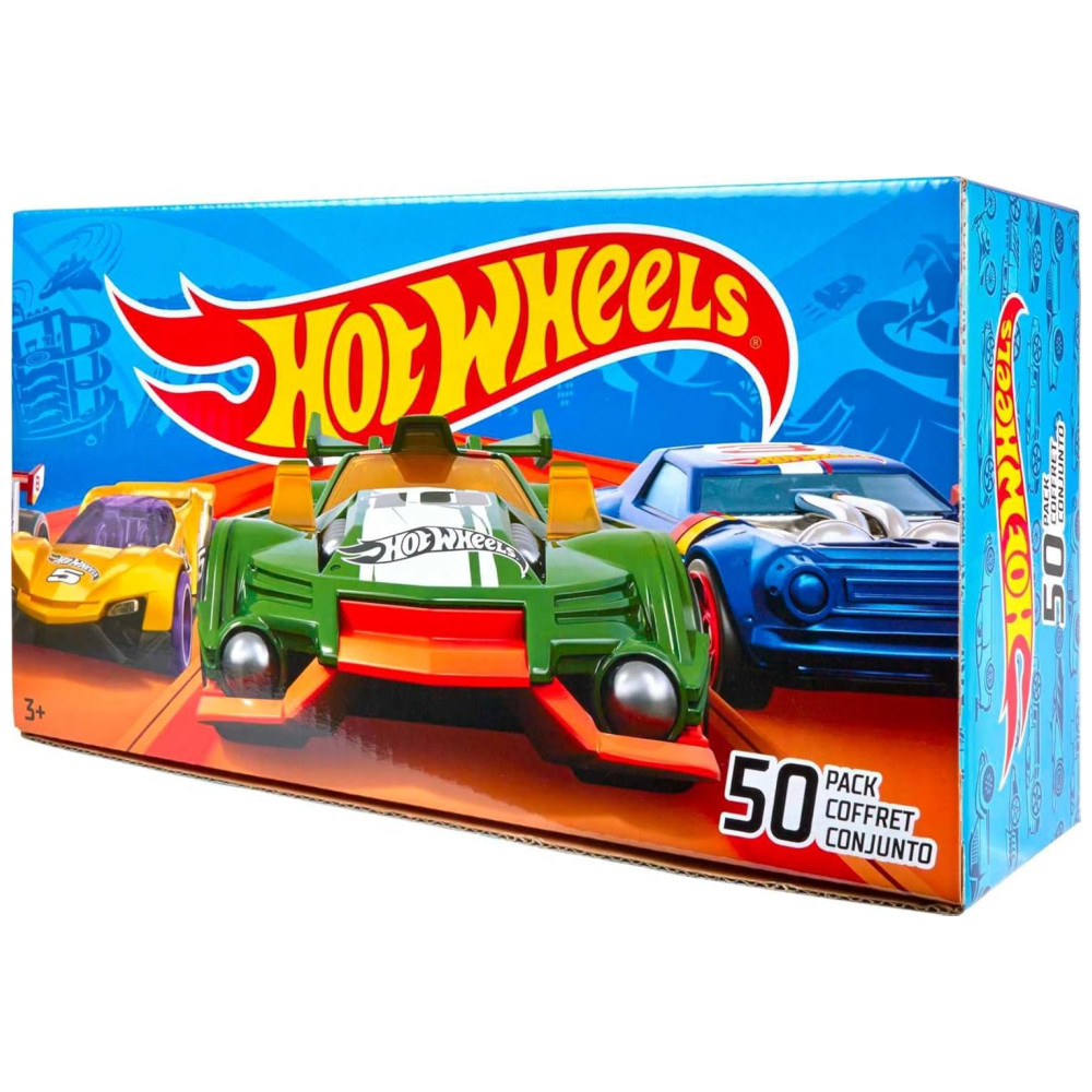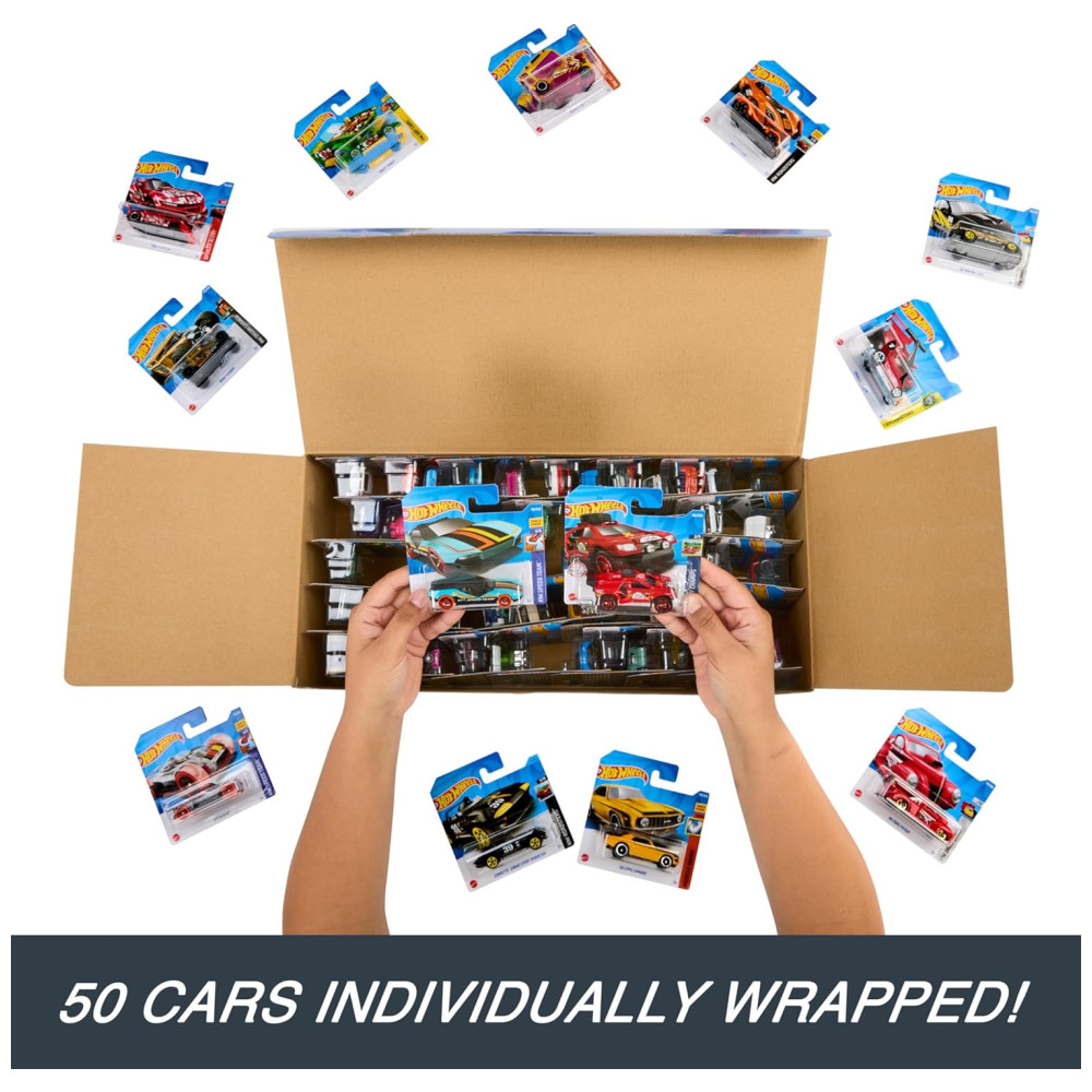 Adquira um incrível conjunto de 50 veículos Hot Wheels em escala 1:64 para iniciar ou expandir sua coleção. Cada carro, caminhão ou motocicleta vem embalado individualmente para aumentar a coleção ou distribuir como uma lembrancinha especial. Este conjunto vem em uma caixa da marca Hot Wheels, o que o torna um presente impressionante para crianças a partir de 3 anos e colecionadores.