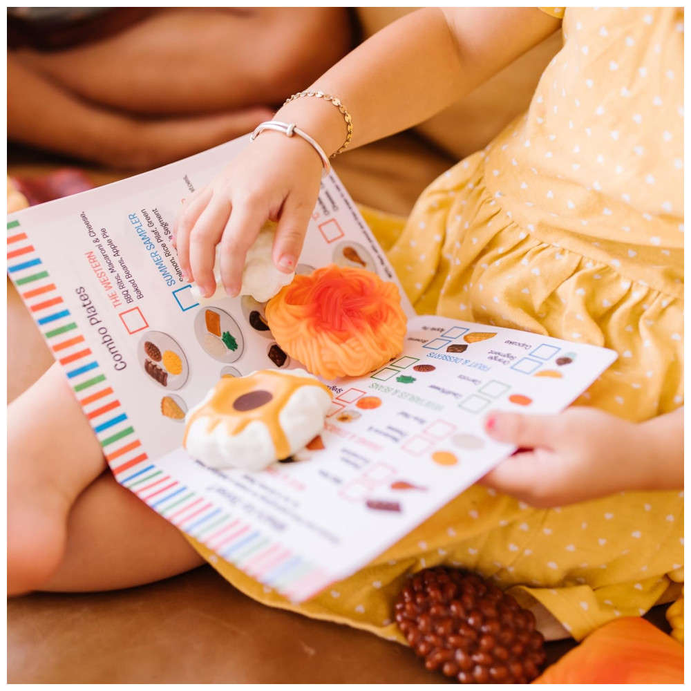 Também há sobremesas como cupcake de frutas, laranja, brownie e torta de maçã. O conjunto acompanha um cardápio reutilizável e colorido que ajuda a identificar as peças e a criar combinações de refeições. Este conjunto de comida pode ser combinado com outras coleções Food Fun para servir diversão bem equilibrada.