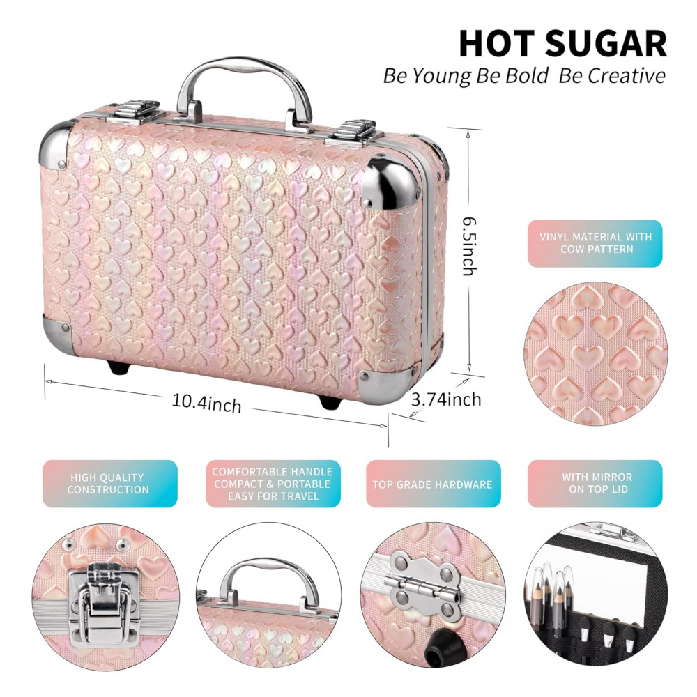 O Kit Completo de Maquiagem Hot Sugar Coração Rosa oferece design all-in-one que organiza todos os itens essenciais em um estojo reutilizável compacto com dimensões de 26,4 x 16,5 x 9,5 cm, ideal para otimização de espaço residencial ou em bolsas de viagem. Equipado com alça superior para transporte em eventos como festas, teatros e apresentações, inclui minipaletas coloridas removíveis para uso modular. O estojo exibe padrão decorativo em coração rosa com couro sintético e espelho embutido, permitindo armazenamento de cosméticos, ferramentas de aplicação, joias e relógios.