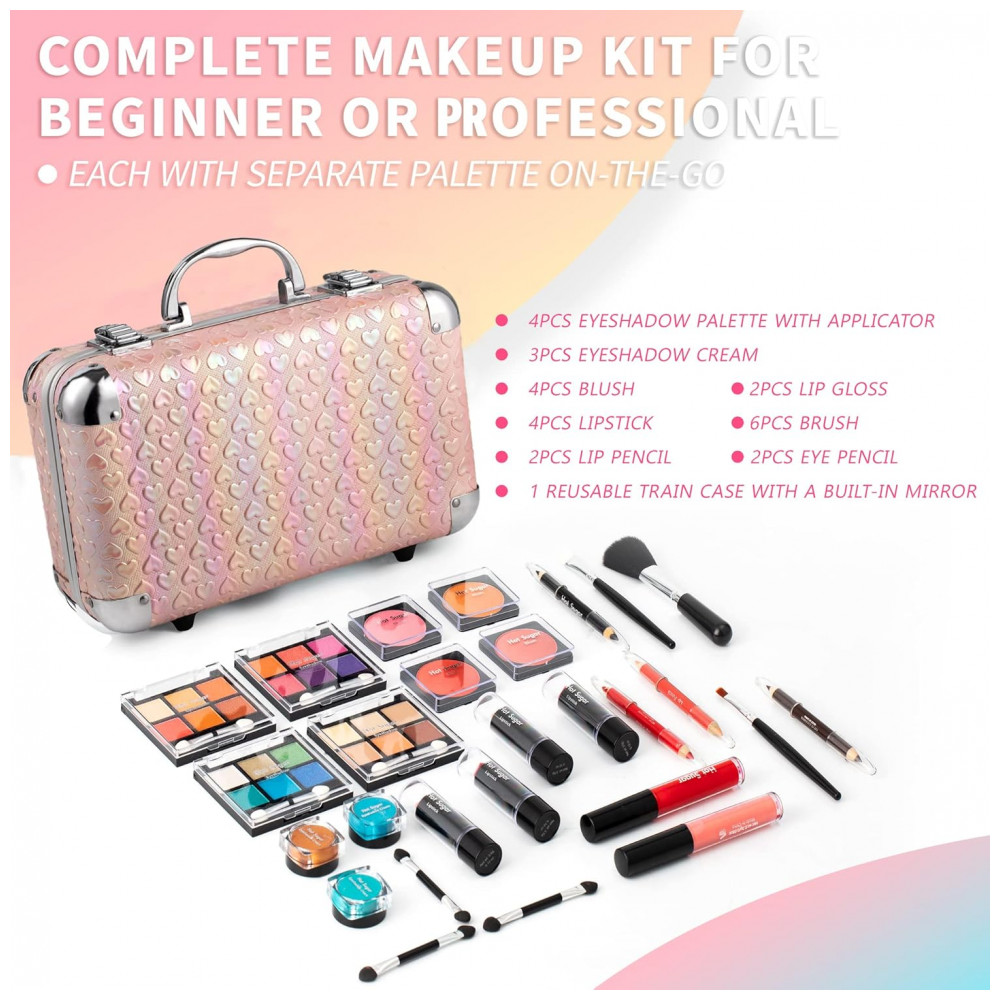 Kit Completo de Maquiagem Hot Sugar Coração Rosa para Iniciantes 27 Sombras 4 Blushes 4 Batons Estojo com Espelho