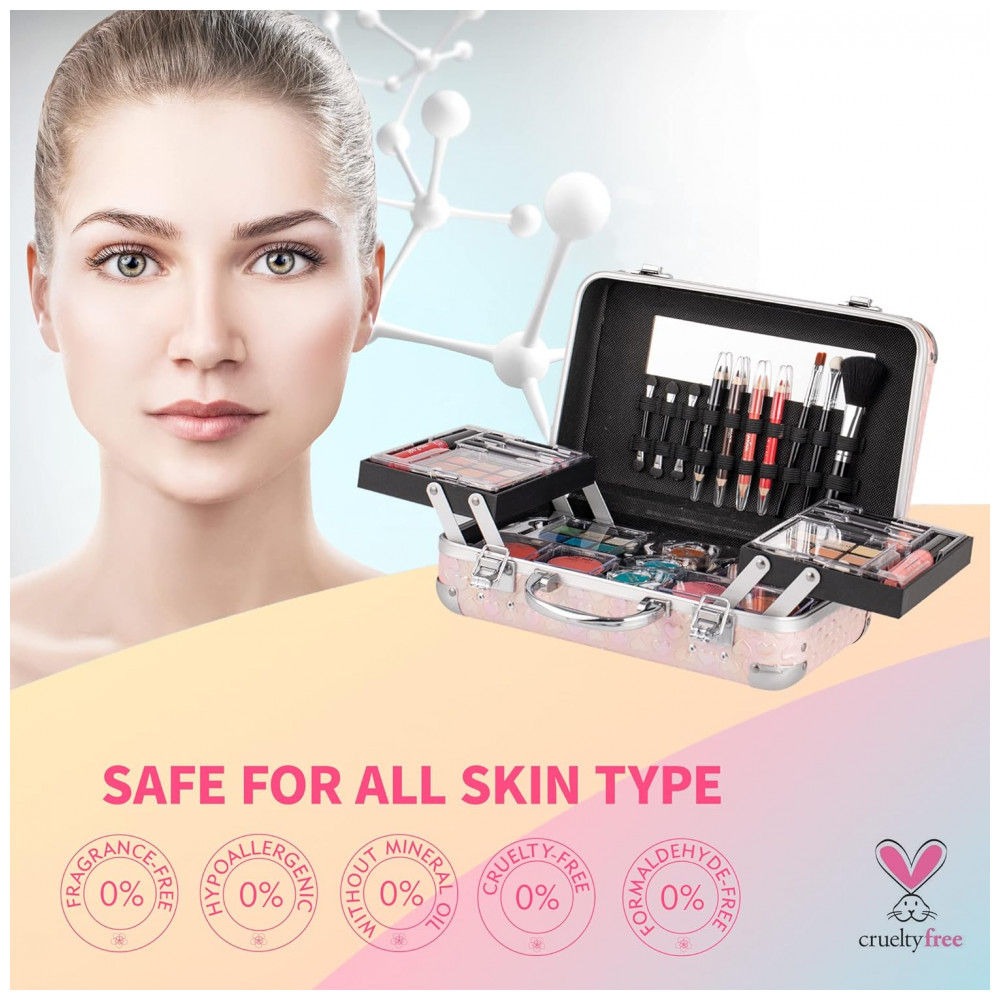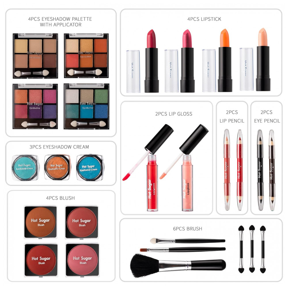 Compõe-se de 27 sombras para olhos em paleta com tons quentes e frios, acabamentos matte e shimmer para combinações cromáticas diversificadas, 4 blushes em minipaletas, 2 gloss labiais, 4 batons, 10 pincéis para precisão na aplicação, 2 lápis labiais e 2 lápis para olhos. Fabricado pela Hot Sugar, enfatiza portabilidade e durabilidade em estrutura rígida com componentes modulares.