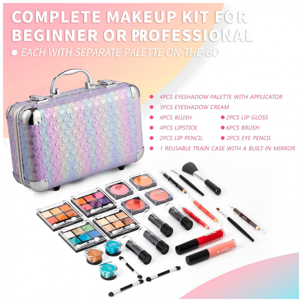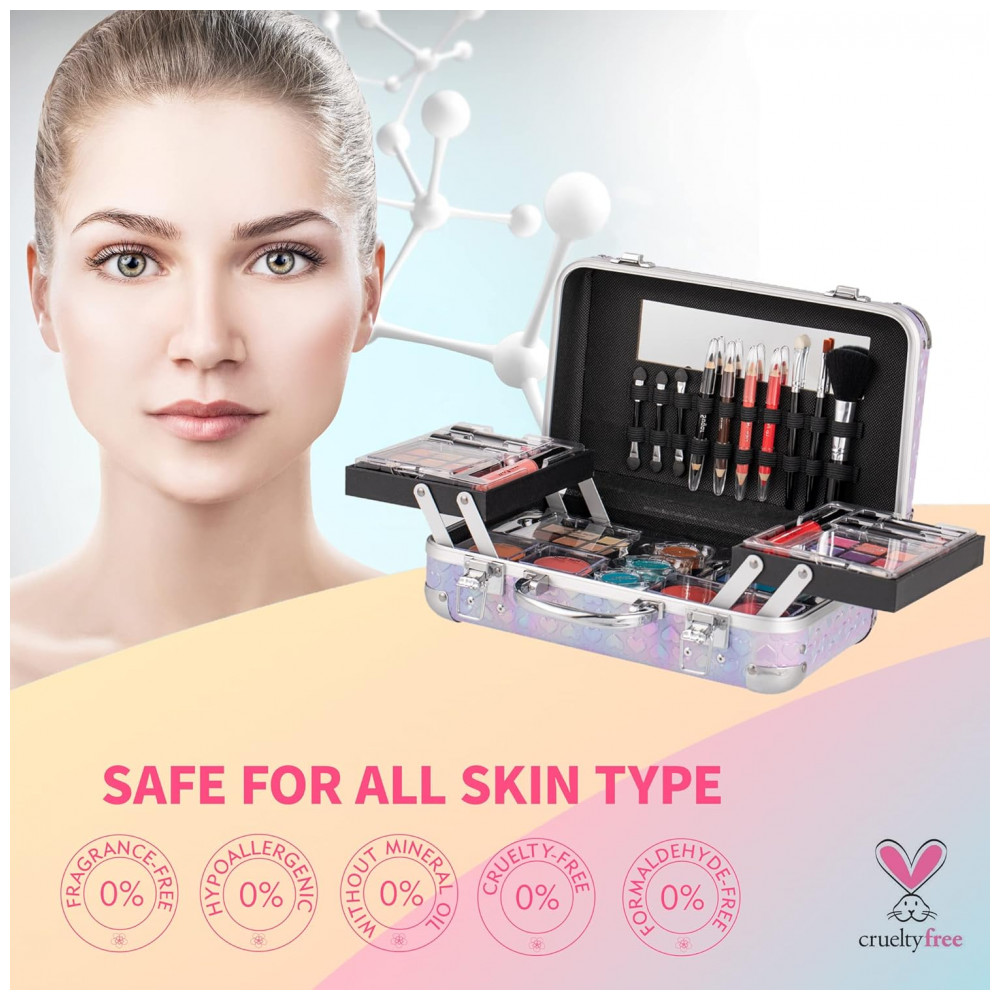 O kit de maquiagem tudo em um da Hot Sugar em design Coração Roxo oferece 59 itens essenciais organizados em uma maleta reutilizável com espelho integrado e alça superior para transporte. Inclui 27 sombras para olhos, 4 blushers, 2 gloss labial, 4 batons, 10 pincéis, 2 lápis labial e 2 lápis para olhos. A estrutura compacta facilita o armazenamento de cosméticos, ferramentas de maquiagem e acessórios, com paletas mini removíveis para uso individual.