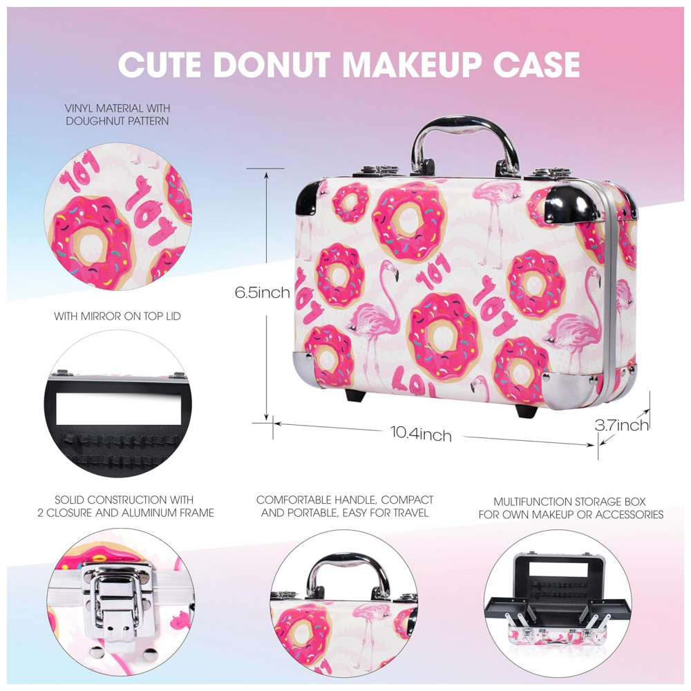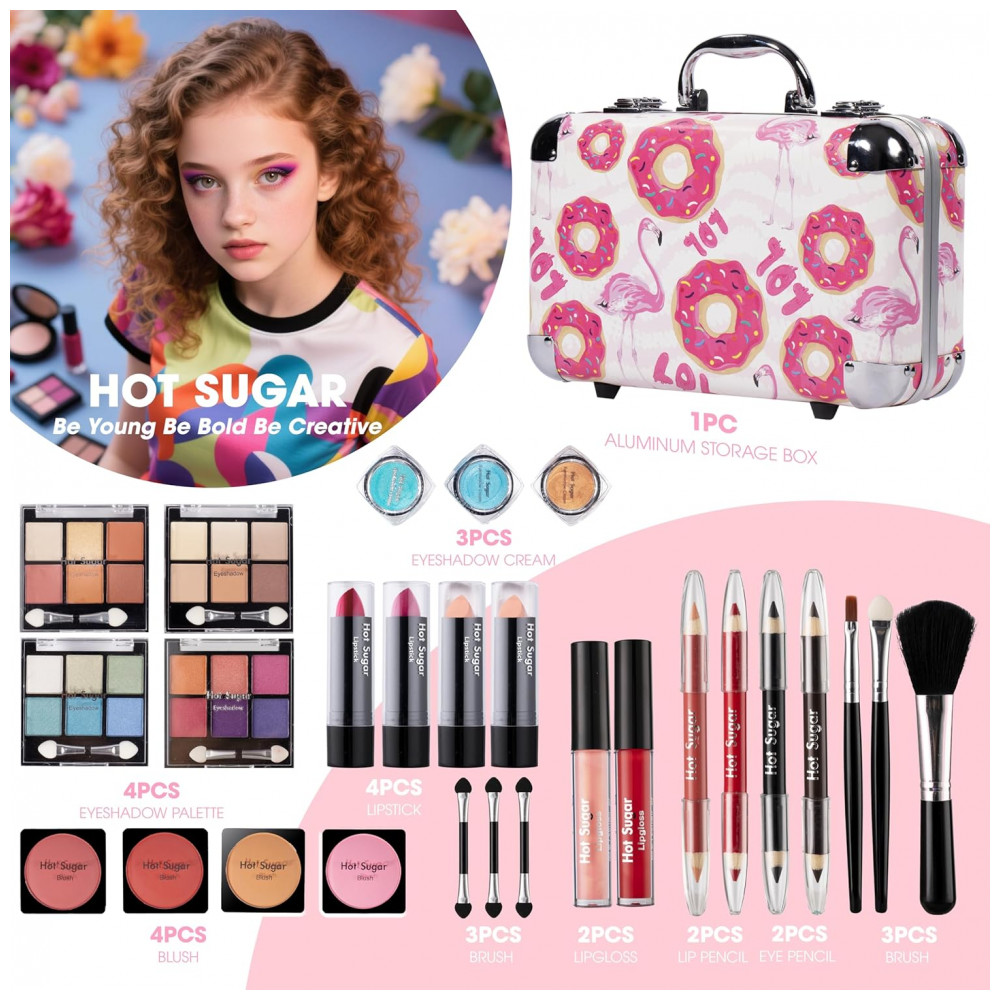 Inclui 27 sombras para olhos em paleta com tons quentes e frios, acabamentos matte e shimmer para combinações cromáticas versáteis, além de 4 blushes em minipaletas, 2 gloss labiais, 4 batons, 10 pincéis para aplicação precisa, 2 lápis labiais e 2 lápis para olhos. O estojo rígido apresenta padrão decorativo em donut, espelho embutido e capacidade para organizar cosméticos, ferramentas, joias e relógios, fabricado pela Hot Sugar com ênfase em portabilidade e durabilidade.