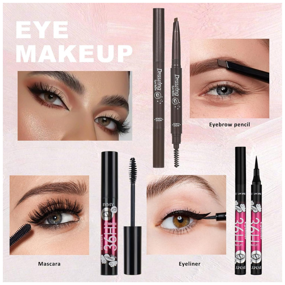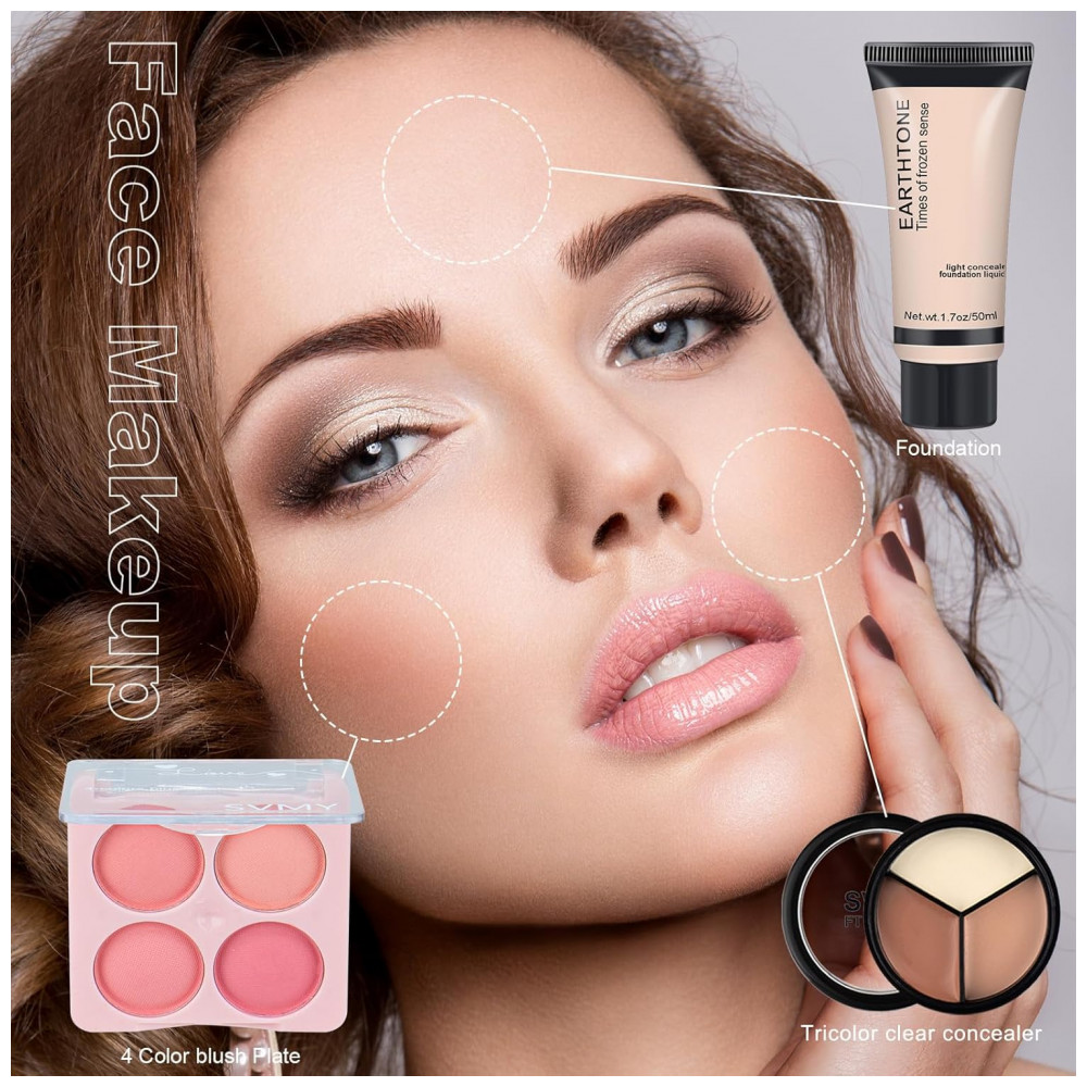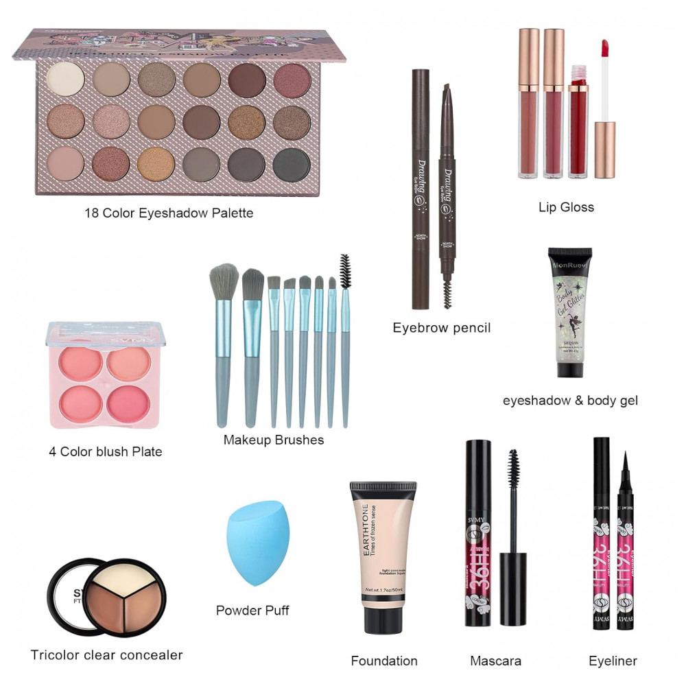 O Kit Completo de Maquiagem MONRUEVT All-in-One reúne 18 tons versáteis de sombras em paleta, gloss labial, lápis para sobrancelhas de precisão, blush de cobertura ajustável, corretivo de alta cobertura, base leve, máscara volumizante para cílios e delineador à prova de borrões em embalagem compacta de 20 x 15 x 4,9 cm.