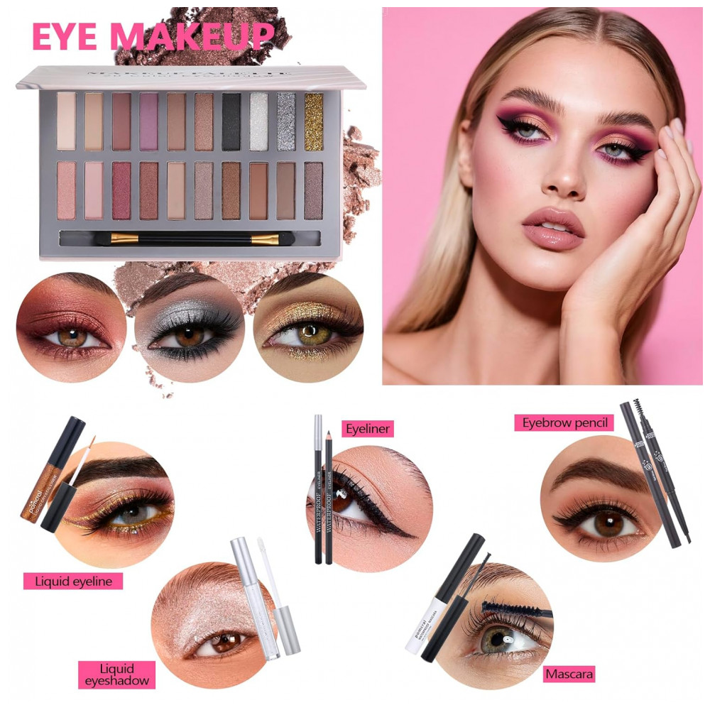 O Kit Completo de Maquiagem Pomcral All-in-One organiza cosméticos essenciais em estojo portátil com dimensões de 15,2 x 7,6 x 2,5 cm, incluindo paleta de 20 cores de sombras com tons nude, shimmer e glitter, pincel de dupla ponta para aplicação profissional nos olhos.