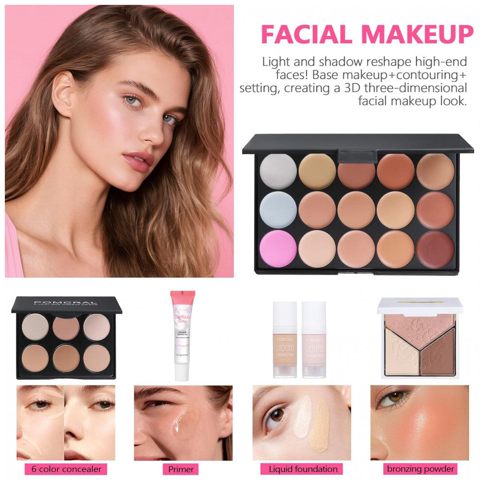 Kit Completo de Maquiagem Pomcral Paleta 20 Cores para Iniciantes Estojo Arco-Íris com Pincéis e Base