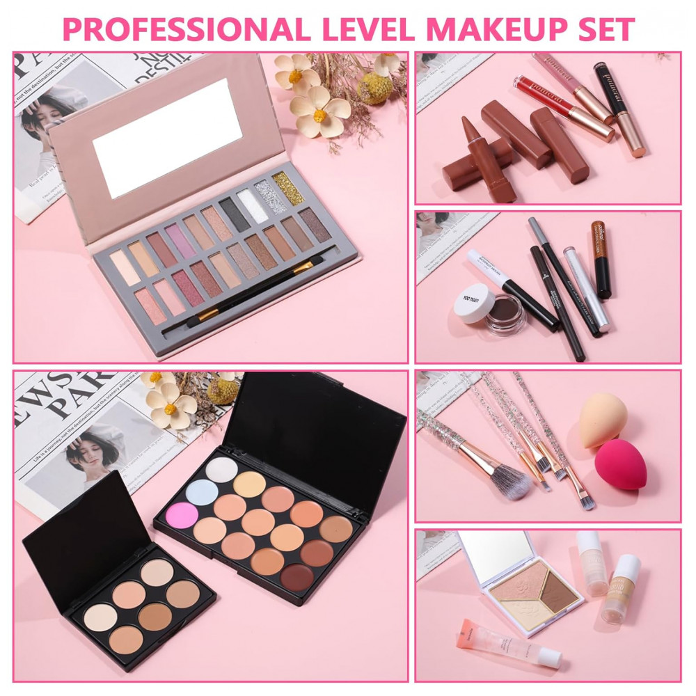 Contém base líquida, primer, 21 tons de corretivo em duas paletas, pó bronzeador para uniformização facial, máscara para cílios, delineador líquido, delineador em lápis, sombra líquida e lápis para sobrancelhas para precisão em maquiagem ocular.