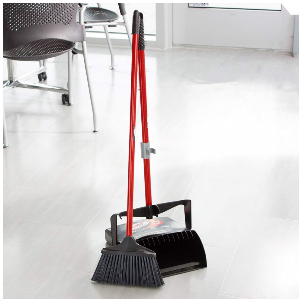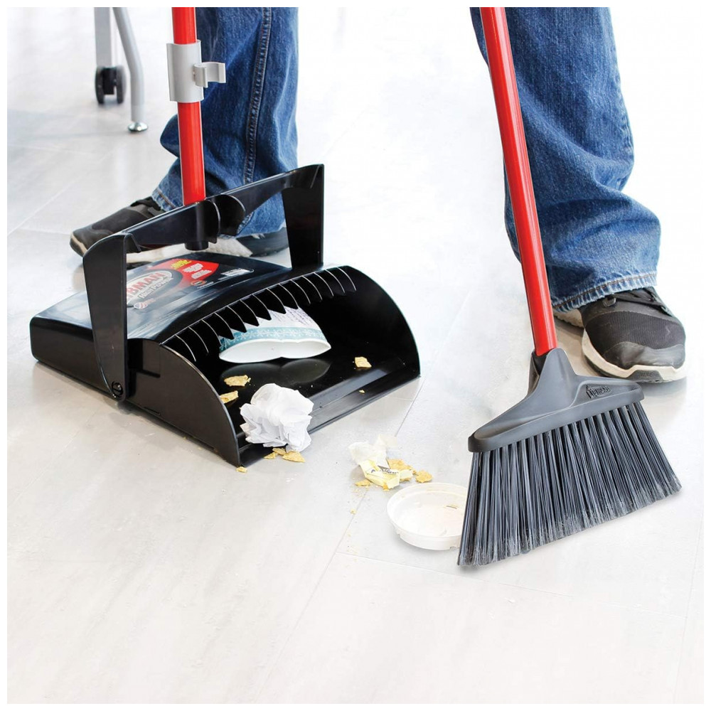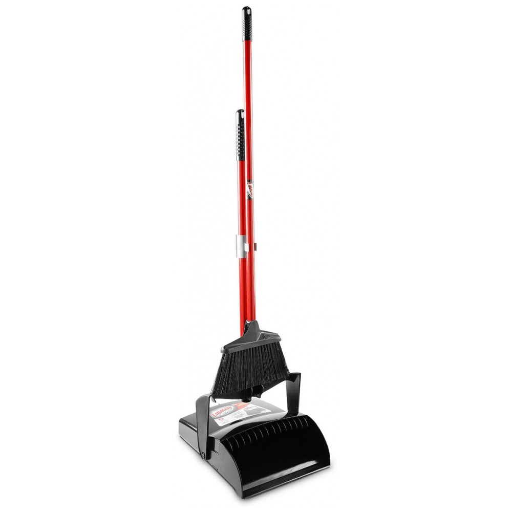 Este conjunto Lobby Broom and Dustpan facilita a limpeza de grandes bagunças em pouco tempo O Lobby Broom de 25 centímetros de largura fica dentro do Dustpan e prende ao cabo para facilitar o zenamento